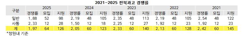 전형별로 살펴보면 일반은 1.88대1로, 52명 모집에 98명이 지원했다. 지난해 2.19대1(48명/105명)보다 모집이 4명 늘어난 반면 지원은 7명 감소해 하락했다. 사회통합은 2.33대1로 12명 모집에 28명이 지원, 지난해 1.5대1(12명/15명)보다 지원이 10명 늘어 상승했다. 전북과고는 지난주 목요일인 5일 원서접수를 마감했지만 주말제외 그보다 이틀 뒤인 9일 오전 경쟁률을 발표했다. 전북과고 관계자는 “원서접수 마감 이후 서류를 정리하고 발표해야 해서 불가피하게 경쟁률 발표 일정이 늦춰졌다”고 설명했다. 지난해 전북과고는 원서접수 마감 하루 뒤 오전 신속하게 경쟁률을 발표하기도 했다.