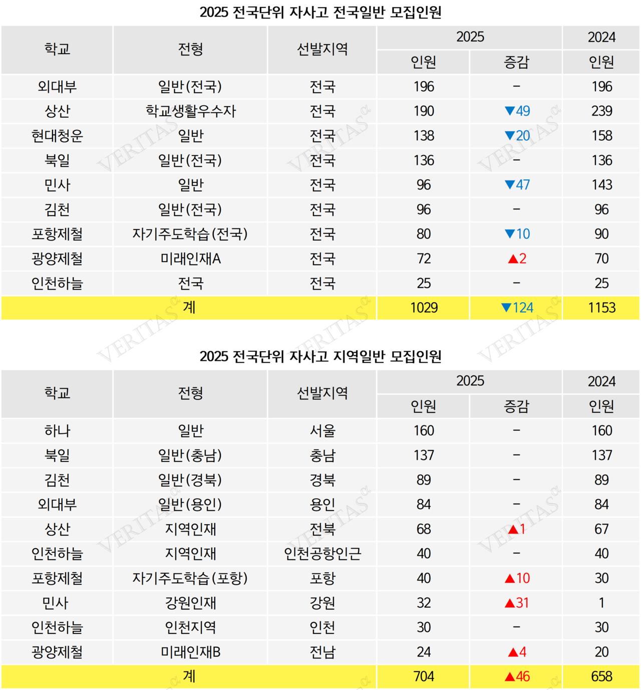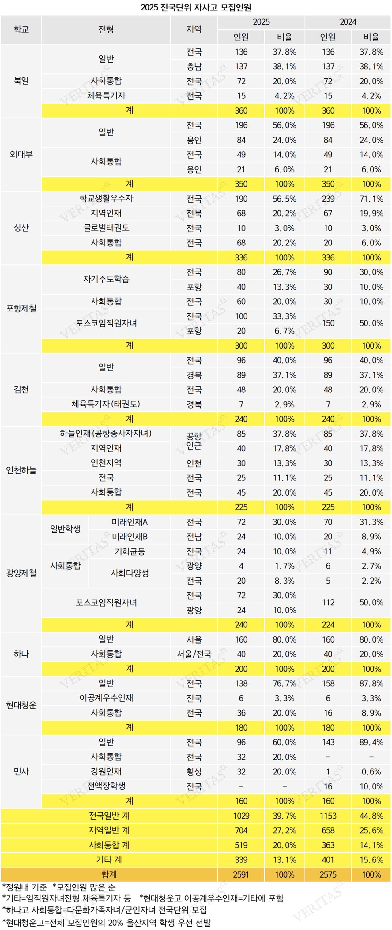 [베리타스알파=조혜연 기자] 올해 전국단위 자사고 10개교(광양제철고 김천고 민사고 북일고 상산고 외대부고 인천하늘고 포항제철고 하나고 현대청운고)는 정원내 2591명을 모집한다. 광양제철고의 모집인원이 지난해보다 16명 증가하면서 전체 모집인원이 확대됐다. 정부가 올해 초 모든 전국자사고에 지역인재와 사회통합으로 전체 모집인원의 각 20%를 모집할 것을 법적으로 의무화하면서 전형 구조가 변경된 곳들이 많다. 김천고 북일고 외대부고 인천하늘고 하나고는 전형별 모집인원에 변동이 없지만, 옛 자립형사립고 출신으로 의무선발 대상에서 제외됐던 광양제철고 민사고 상산고 포항제철고 현대청운고는 전국선발의 비중을 축소하고 지역선발과 사회통합을 확대하는 방향으로 변경했다. 10개교 전체 모집인원으로 따져보면 전국일반은 지난해 1153명에서 올해 1029명으로 축소됐고, 지역일반은 658명에서 704명으로 확대, 사회통합도 363명에서 519명으로 확대됐다.