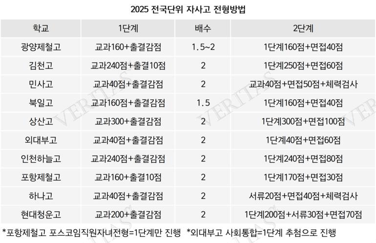 상산고는 1단계에서 교과300점과 출결감점을 반영해 2배수를 선발하고, 이후 1단계300점+면접100점으로 최종 선발한다. 현대청운고는 1단계에서 교과200점과 출결감점을 적용해 2배수 내외를 선발한 후, 2단계에서 서류30점+면접70점으로 평가하며, 1단계성적 200점과 2단계성적 100점을 합산해 최종 선발한다.
