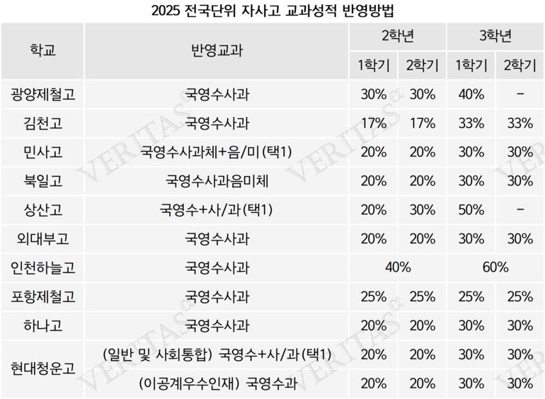 국영수사과 외 음미체 예체능 과목을 반영하는 곳은 민사고와 북일고 두 곳뿐이다. 상산고는 국영수를 기본으로 사회와 과학 중 한 과목을 택해 모두 네 과목을 반영한다. 현대청운고는 전형별로 반영 과목이 다르다. 국영수를 기본으로 일반/사회통합은 사회 과학 중 한 과목을 택할 수 있고, 이공계우수인재는 과학을 반영한다. 이외 7개교는 모두 국영수사과 다섯 과목을 반영한다.