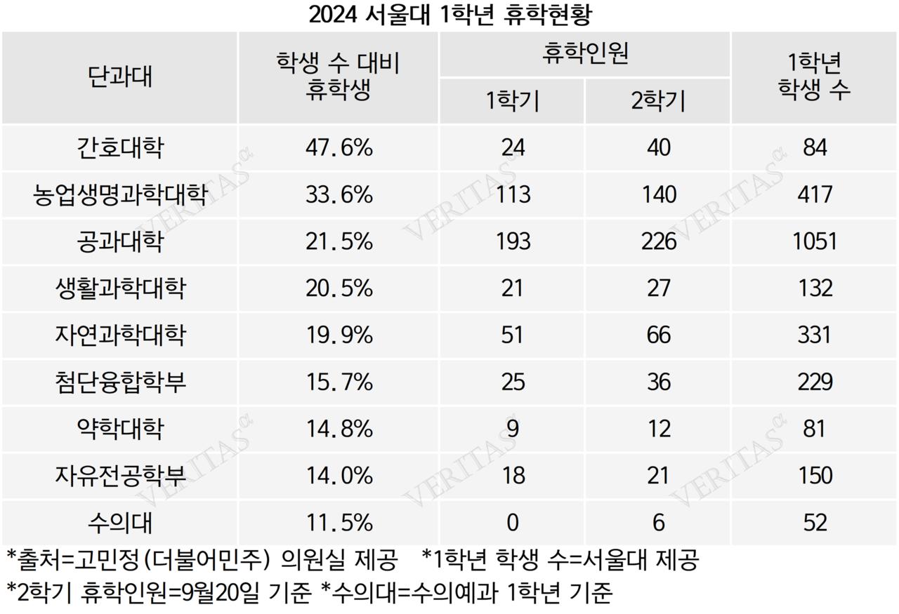 [베리타스알파=조혜연 기자] 의대증원이 확정된 5월 이후 대학가에선 이미 휴학생이 급증하면서 타격이 가시화되고 있는 것으로 나타났다. 국회 교육위원회 고민정(더불어민주) 의원이 24일 서울대로부터 제출받은 휴학 현황 자료에 따르면, 20일 기준 1학년 휴학생 수가 813명에 달하는 것으로 나타났다. 1학기 673명 보다 20.8%가 늘었다. 자연계열만 따져보면 심각성이 더욱 두드러진다. 소속학과 전체가 자연계열인 공대 자연과학대 첨단융합학부 3개 단과대 1학년 1611명 중 휴학생은 328명이다. 5명 중 1명이 휴학한 상태다.