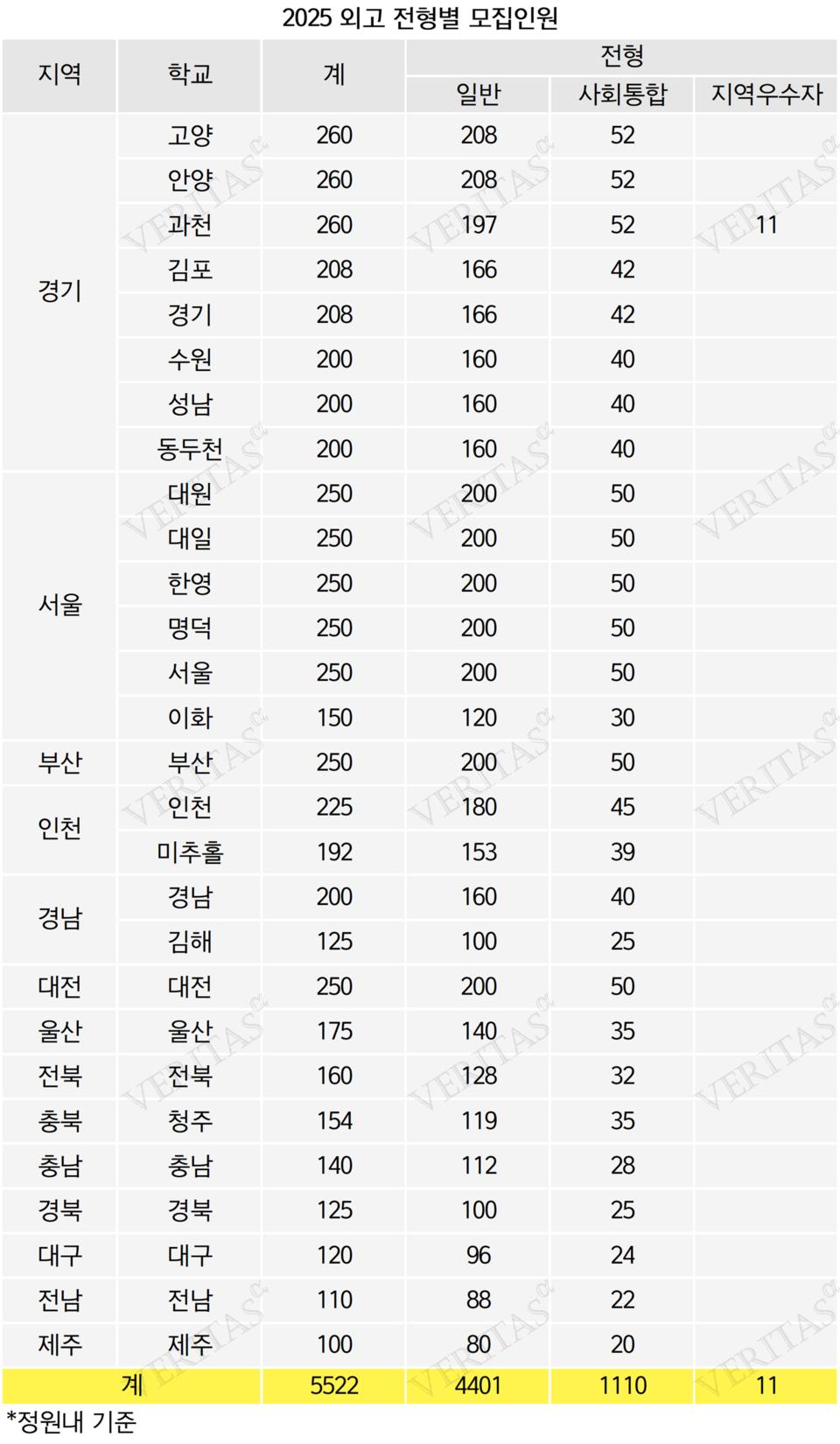 전체 모집인원은 고양외고 과천외고 안양외고가 각 260명으로 가장 많다. 이어 대원외고 대일외고 명덕외고 서울외고 한영외고 대전외고 부산외고 각 250명, 인천외고 225명, 경기외고 김포외고 각 208명, 동두천외고 성남외고 수원외고 경남외고 각 200명 순으로 많이 모집한다. 이어 미추홀외고 192명, 울산외고 175명, 전북외고 160명, 청주외고 154명, 이화외고 150명, 충남외고 140명, 경북외고 김해외고 각 125명, 대구외고 120명, 전남외고 110명, 제주외고 100명 순이다.