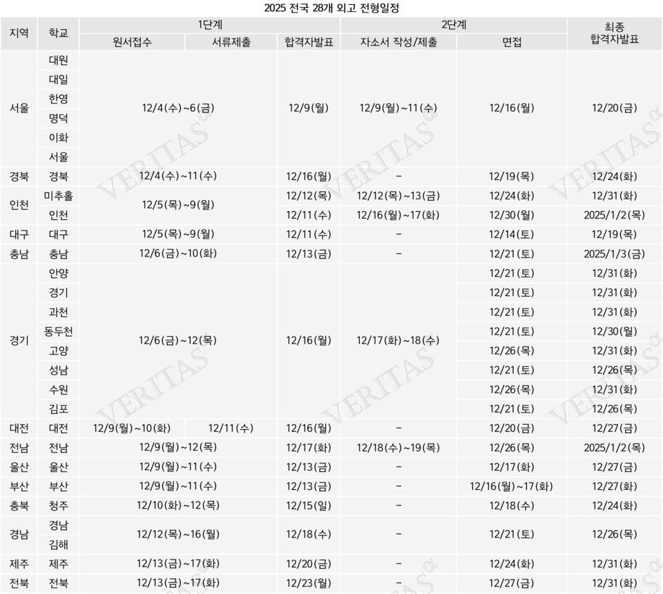 올해 외고 28개교의 원서접수는 서울 6개교와 경북외고를 필두로 12월4일 시작한다. 서울 6개교가 12월4일부터 6일까지, 경북외고가 4일부터 11일까지 접수한다. 인천지역 2개교와 대구외고는 5일부터 9일까지, 충남외고는 6일부터 10일까지, 고양 경기 과천 동두천 고양 성남 수원 김포 등 경기 지역 7개교가 6일부터 12일까지다. 대전외고는 9일부터 10일까지, 울산외고 부산외고가 9일부터 11일까지, 청주외고가 10일부터 12일까지, 경남 김해외고가 12일부터 16일까지, 제주 전북외고가 13일부터 17일까지로 외고 원서접수가 마무리된다.