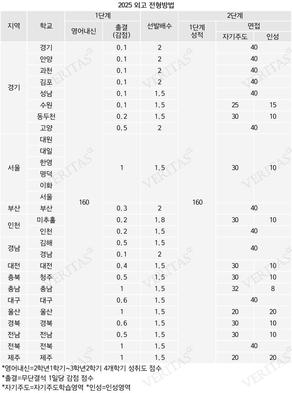 전형방법은 1단계에서 영어 내신과 출결로 모집인원의 1.5~2배수를 선발한 뒤 2단계에서 면접을 거쳐 최종 선발하는 방식이다. 1단계 160점, 2단계 40점 등 200점 만점 고득점 순으로 합격자를 정한다. 1단계 선발 배수는 학교마다 다르다. 경기 안양 과천 김포 고양 부산 미추홀 경남 강원의 9개교는 2배수를 뽑는다. 이외 19개교는 모두 1.5배수를 선발한다. 대구외고가 지난해 1단계에서 1.8배수를 선발했으나, 올해는 1.5배수로 축소했다.