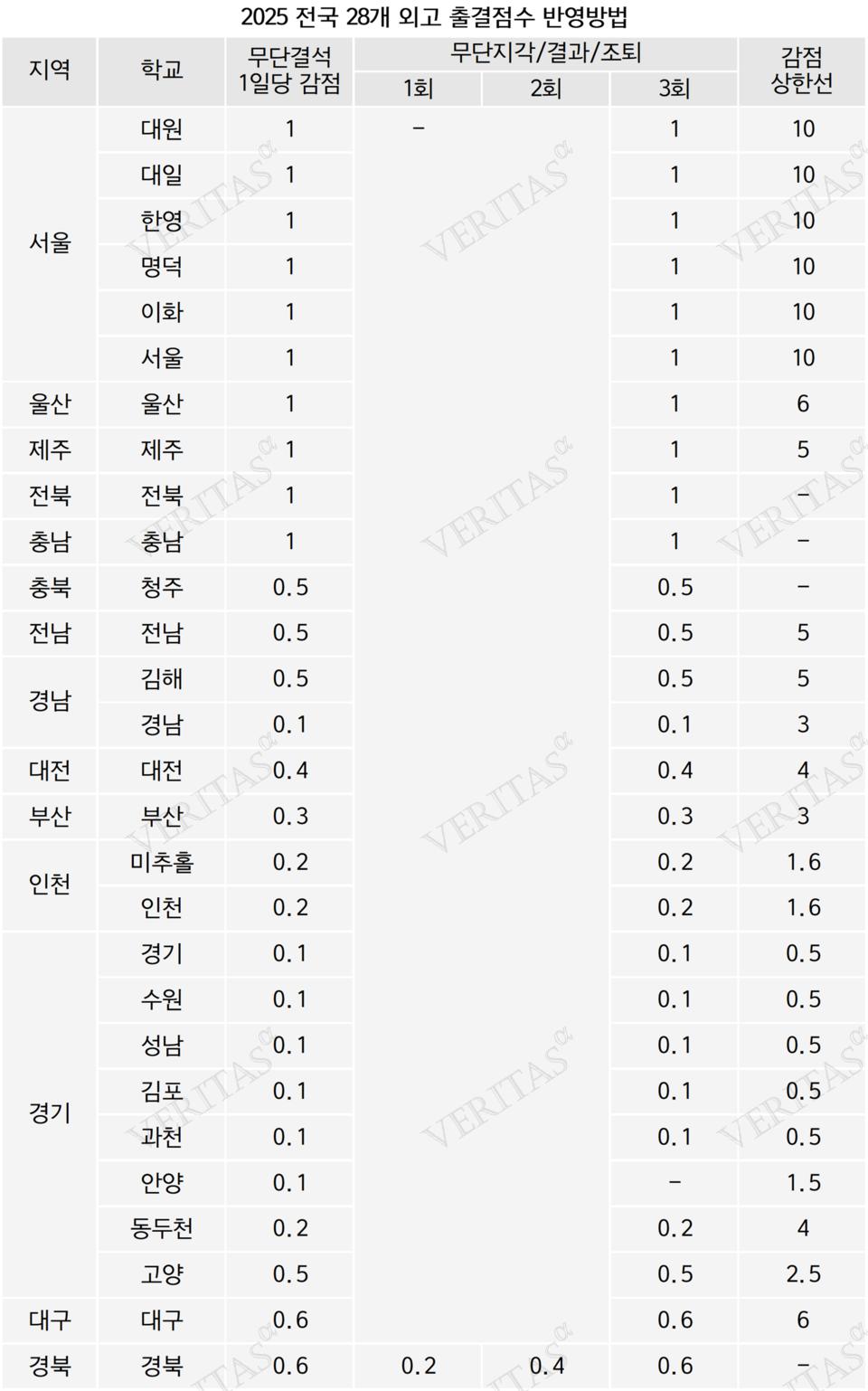 청주 전남 김해 고양은 무단결석 1일당 0.5점, 대전은 0.4점, 부산은 0.3점, 미추홀 인천 동두천은 0.2점, 경기 수원 성남 김포 과천 안양 경남은 0.1점 감점한다. 대구는 지난해 1일당 0.1점에서 올해는 0.6점으로 감점폭이 커졌다. 감점 상한선도 5일 이상에서 10일 이상으로 길어지면서 최대 6점까지 감점할 수 있다. 출결의 영향력이 확대된 셈이다.