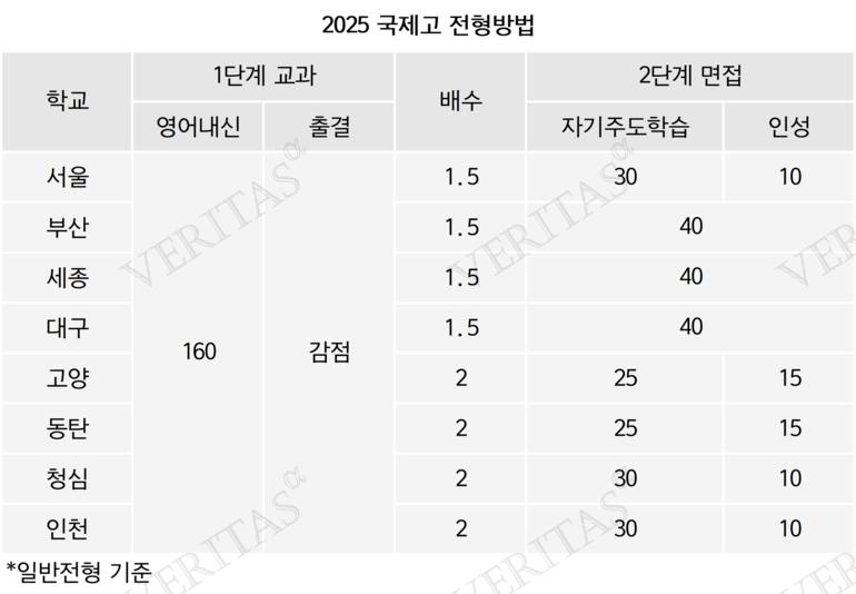 전형 방법은 지난해와 동일하다. 1단계에서 영어 내신 성적과 출결 감점으로 일정 배수를 선발한 뒤, 2단계 면접 점수를 합산해 최종 합격자를 결정하는 방식이다. 1단계에선 8개교 모두 2학년1학기부터 3학년2학기까지 4개 학기 영어 성적을 160점 만점으로 환산한다. 학기별 반영 비율은 각 40점으로 동일하다. 학교별 1단계 합격자 선발 배수는 1.5배 또는 2배수다. 대구 부산 서울 세종의 4개교는 모집 인원의 1.5배수를 선발하고, 고양 동탄 인천 청심의 4개교는 2배수를 선발한다.