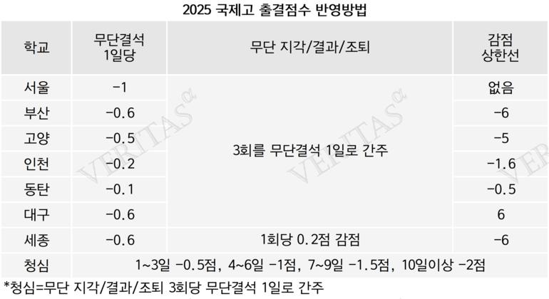 출결 점수는 무단 결석 일수에 가중치를 곱해 감점하는 방식으로 반영한다. 서울이 무단 결석 1일당 1점 감점으로 가중치가 가장 높다. 감점 상한선도 없어서 출결이 좋지 않으면 점수가 크게 깎일 수 있다. 부산 세종 대구가 각 0.6점, 고양이 0.5점, 인천이 0.2점, 동탄이 0.1점 감점한다. 감점 상한선은 부산 세종 대구 6점, 고양 5점, 인천 1.6점, 동탄 0.5점 순이다. 청심은 구간 감점 방식을 취한다. 무단 결석 1~3일은 0.5점, 4~6일은 1점, 7~9일은 1.5점, 10일 이상은 2점을 감점한다. 고양 대구 동탄 서울 부산 인천의 6개교는 무단 지각/결과/조퇴 3회를 무단 결석 1일로 간주한다. 세종은 무단 지각/결과/조퇴 1회당 0.2점 감점한다.