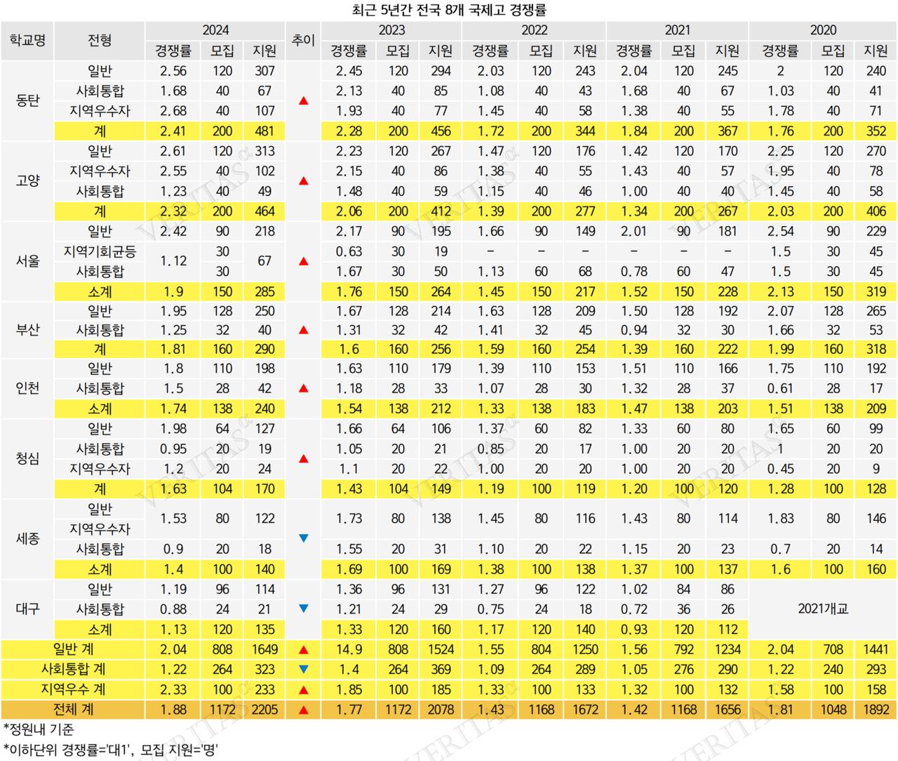 지난해 국제고 8개교의 경쟁률은 평균 1.88대1을 기록했다. 정원내 1172명 모집에 2205명이 지원했다. 국제고 경쟁률은 2019학년 2.19대1(모집 1048명/지원 2295명)에서 특목자사의 일반고 전환 이슈가 불거진 2020학년 1.81대1(1048명/1892명)로 급락했다. 이어 2021학년 1.42대1(1168명/1656명), 2022학년 1.43대1(1168명/1672명)로 하락했지만, 정권교체 이후 2023학년 1.77대1(1172명/2078명), 2024학년 1.88대1로 다시 상승했다.