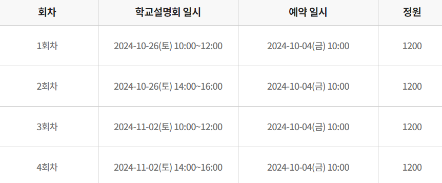 예약은 10월4일 오전10시부터 선착순으로 마감한다. 안전사고를 방지하기 위해 예약하지 않을 경우 설명회 입장을 제한한다. 회차당 1200명까지 참석이 가능하며, 1인당 4인까지 예약할 수 있다. 1~4차 모두 동일한 내용으로 중복 신청은 불가하다. 중복 신청 시 접수가 취소될 수 있으니 유의해야 한다. 설명회 예약은 하나고 홈페이지-입학안내-학교설명회-신청안내에서 신청할 수 있다.
