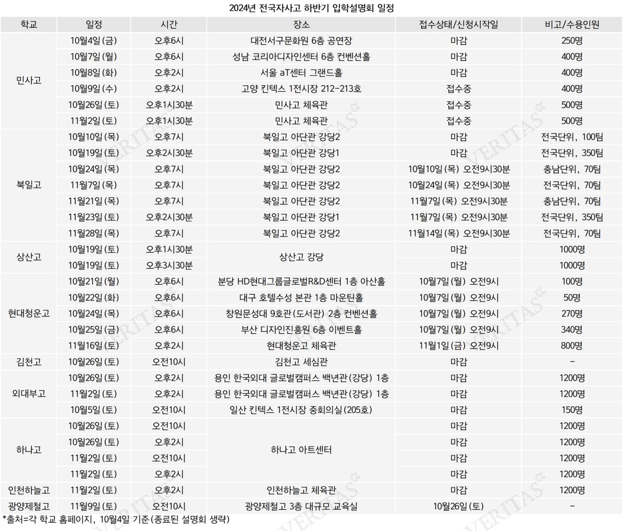 [베리타스알파=조혜연 기자] 자사고 외고 국제고 등 후기고가 12월 원서접수를 앞두고 막판 입학설명회에 박차를 가한다. 상반기 설명회에선 전반적인 학교의 분위기와 교육 프로그램 등을 위주로 안내했다면, 하반기엔 2025 신입생 모집요강이 확정된 만큼 세부적인 전형요소와 지난해 입결 등 실질적인 입학전형에 대해 상세히 안내할 예정이다. 자소서와 면접 작성에 관해 특강은 물론 기출문제 공개까지 예고한 곳도 있으니 특히 고입을 목전에 앞둔 중3 학생이라면 하반기 설명회에 참석해보는 것이 큰 도움이 될 수 있다.