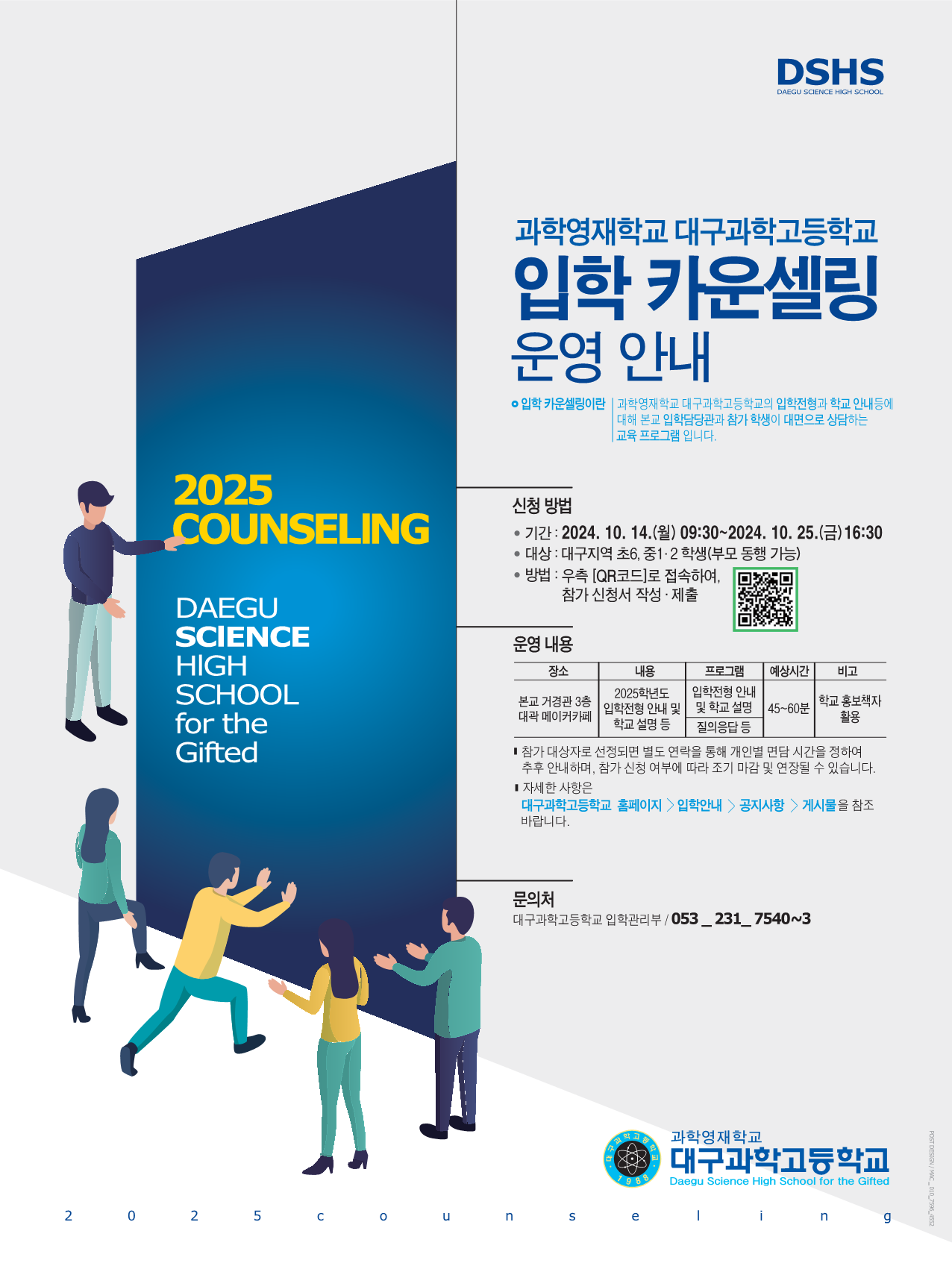[베리타스알파=정성민 기자] 대구과고가 2024학년도 입학 카운셀링(대면 상담)을 실시한다고 7일 발표했다. 대구지역 초6부터 중2 학생을 대상으로 입학담당관이 직접 입학전형에 대해 상담을 제공한다. 입학담당관이 직접 나서서 초등학생을 대상으로 입학상담을 제공하는 영재학교는 현재 대구과고가 유일하다. 교육 수요자들이 궁금증과 불안감을 해소하기 위해 사전에 맞춤형 상담 프로그램을 제공하는 프로그램으로 수요자 친화적인 입시운영이다. 입시업계에선 최근 초등 의대반까지 신설되는 등 의대열풍으로 이공계 교육이 위기를 겪고 있는 상황에서 인재를 조기 선점하기 위한 학교 측의 행보가 돋보인다고 평가한다.