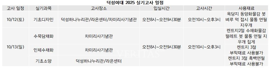 [베리타스알파=이상현 기자] 덕성여대가 12일, 13일 양일간 수시모집 미술실기전형 미술실기고사를 진행한다. 실기과목은 기초디자인/수묵담채화/인체수채화/기초소양이다. 기초디자인은 26명, 나머지 과목은 각각 10명씩 선발한다. 기초디자인은 12일, 나머지 과목은 13일에 실기고사가 진행된다. 고사시간은 동일하게 5시간이다.