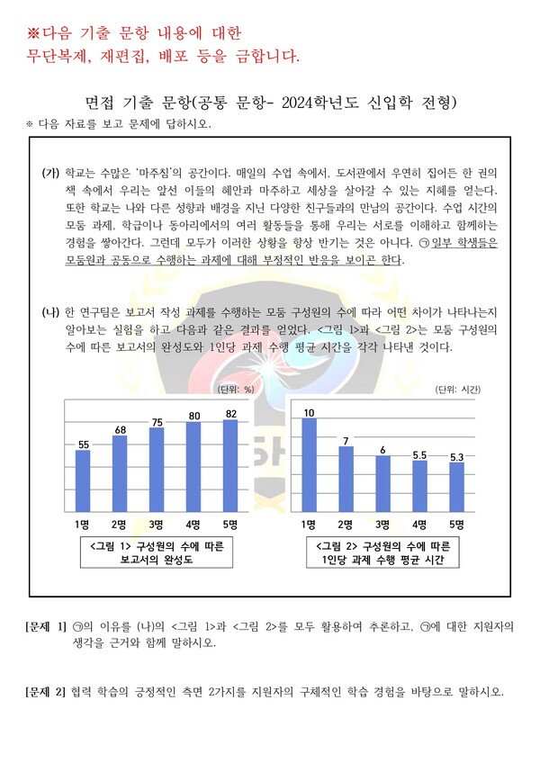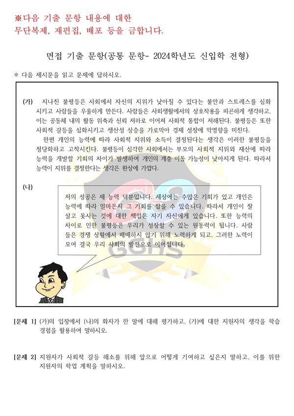 [베리타스알파=정성민 기자] 고양국제고가 2025학년 입학 지원자를 위해 면접 기출 공통문항을 공개했다. 2017학년~2020학년, 2023학년, 2024학년까지 총 6개년 자료다. 2021, 2022학년의 경우 공통 문항이 없었다. 사교육 없이도 수요자들이 면접에 대비할 수 있도록 학교 측에서 투명하게 기출문제를 공개한 것으로 수요자 친화적인 입시 행보가 돋보인다.