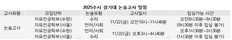 고사장소는 서울/수원 캠퍼스 관계 없이 모두 수원캠인 점에 유의해야 한다. 예지관(4강의동)/덕문관(5강의동)/종합강의동에서 진행된다. 반드시 개인별 고사장을 조회 후 입실해야 한다. 고사장 조회는 내달 15일 경기대 입학처 홈페이지에서 할 수 있다. 논술고사 당일 차량은 교내에 진입할 수 없다. 입실시간이 지나면 출입구가 통제되기에 유의해야 한다. 준비물은 수험표/신분증/컴퓨터용 사인펜/흑색 필기구 등이다. 모바일 신분증은 인정하지 않는다. 통신기기는 일체 사용할 수 없으나 시각표시 기능만 있는 시계는 허용한다.