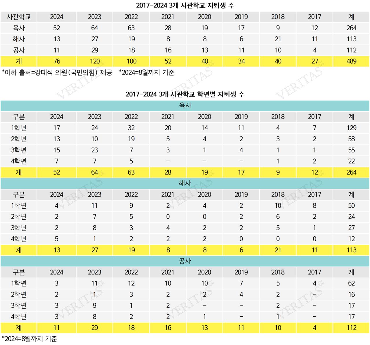 강대식 의원(국민의힘)이 국방부와 사관학교로부터 제출받은 자료에 따르면 2017년부터 2024년 8월까지 자퇴한 인원이 489명에 달하는 것으로 나타났다. 사관학교별로 살펴보면 육사 264명, 해사 113명, 공사 112명이 자퇴한 것으로 집계됐다. 육사의 경우 한 해 모집인원이 330명으로 해사(170명) 공사(235명)에 비해 많은 특징이 있다. 해사 측은 “학령인구의 감소와 직업군인의 직업선호도 하락에 따라 사관학교 향후 입학 지원율이 감소하고 현재와 유사한 수준의 자퇴자가 발생할 것으로 예상한다”고 답변했다.