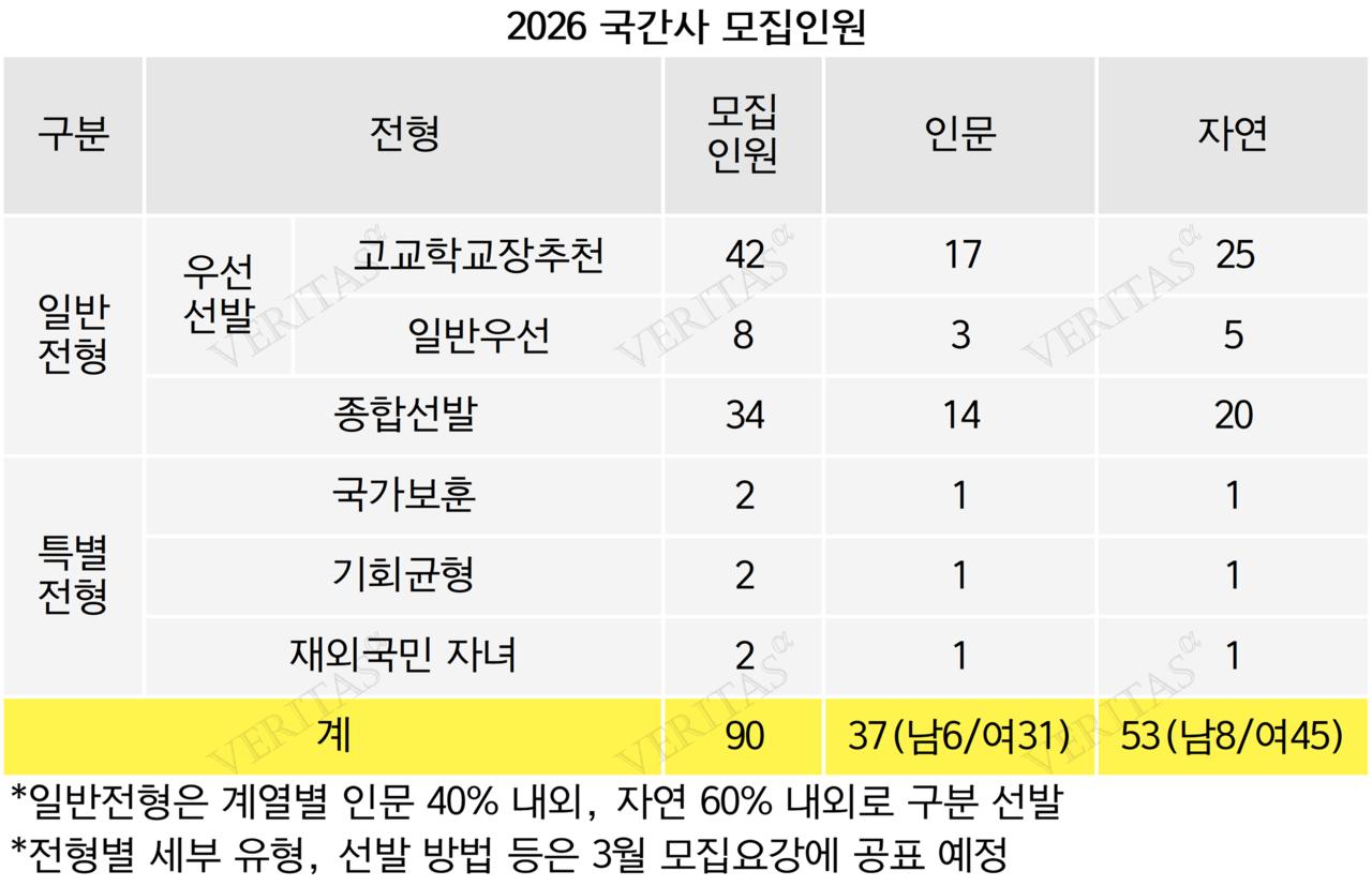 육사에 이어 두 번째로 2026학년 기본계획을 공개한 국간사는 90명을 모집한다. 남성 14명, 여성 76명으로 전년과 동일하다. 계열별로는 인문 37명(남 6명/여 31명), 자연 53명(남 8명/여 45명)이다. 전형별 모집인원 역시 전년과 동일하다. 고교학교장추천 42명, 일반우선 8명, 종합선발 34명, 특별전형(국가보훈, 기회균형, 재외국민) 6명을 모집한다. 전형별 세부 선발방법 등은 세부계획에 포함해 3월 공개할 예정이다.