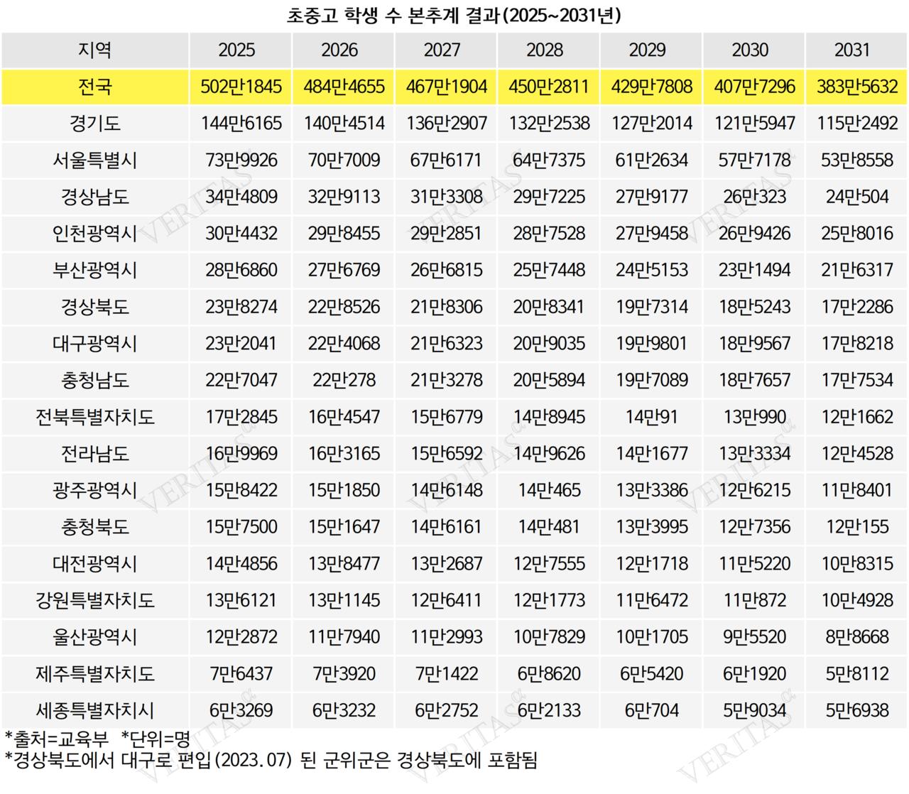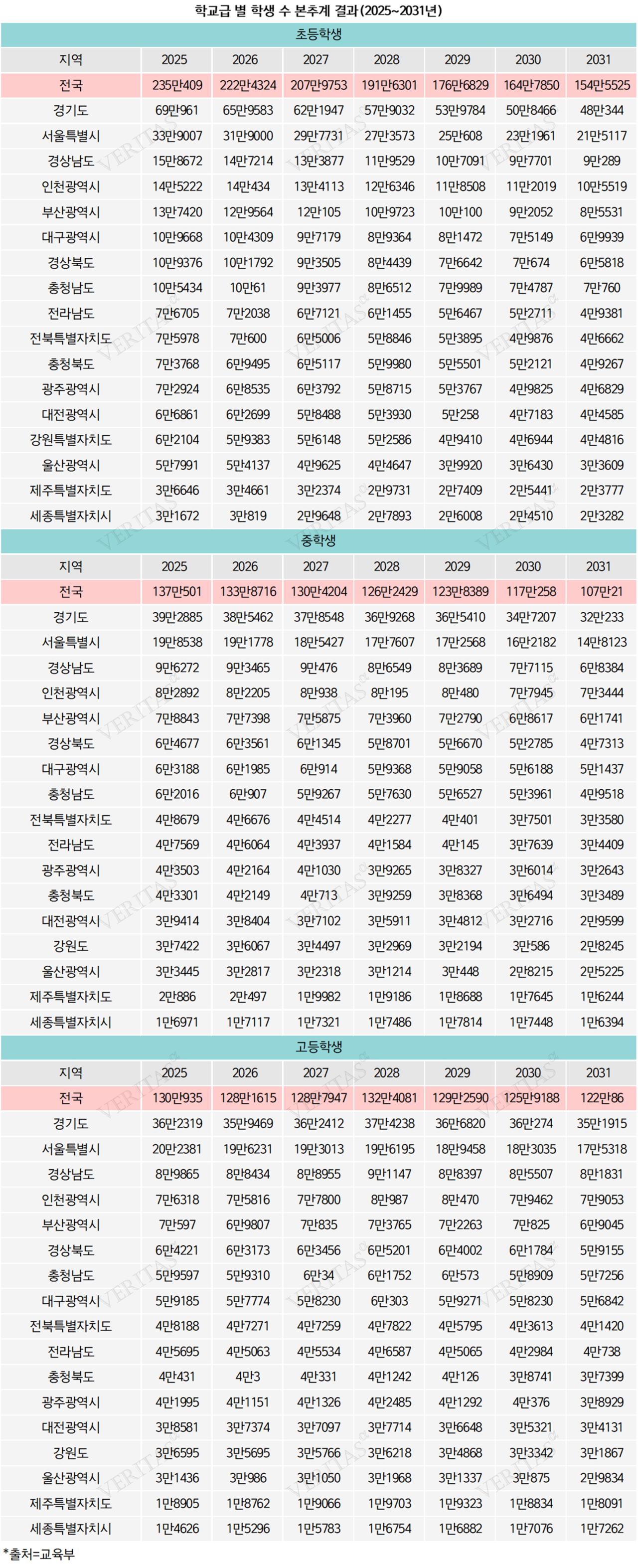 특히 초등학생의 경우 매년 하락세가 가파르다. 2025년 전국 초등학생은 총 235만409명인데 △2026년 222만4324명 △2027년 207만9753명 △2028년 191만6301명 △2029년 176만6829명 △2030년 164만7850명에서 2031년에는 154만5525명까지 급감한다. 대도시인 경기도 69만명에서 48만명으로, 서울도 33만명에서 21만명으로 감소한다. 현재는 17개 시도 중 8개 시도의 초등학생이 각 10만명을 넘기는데, 2031년에는 서울 경기 인천 등 수도권의 초등학생만 10만명을 넘길 전망이다.