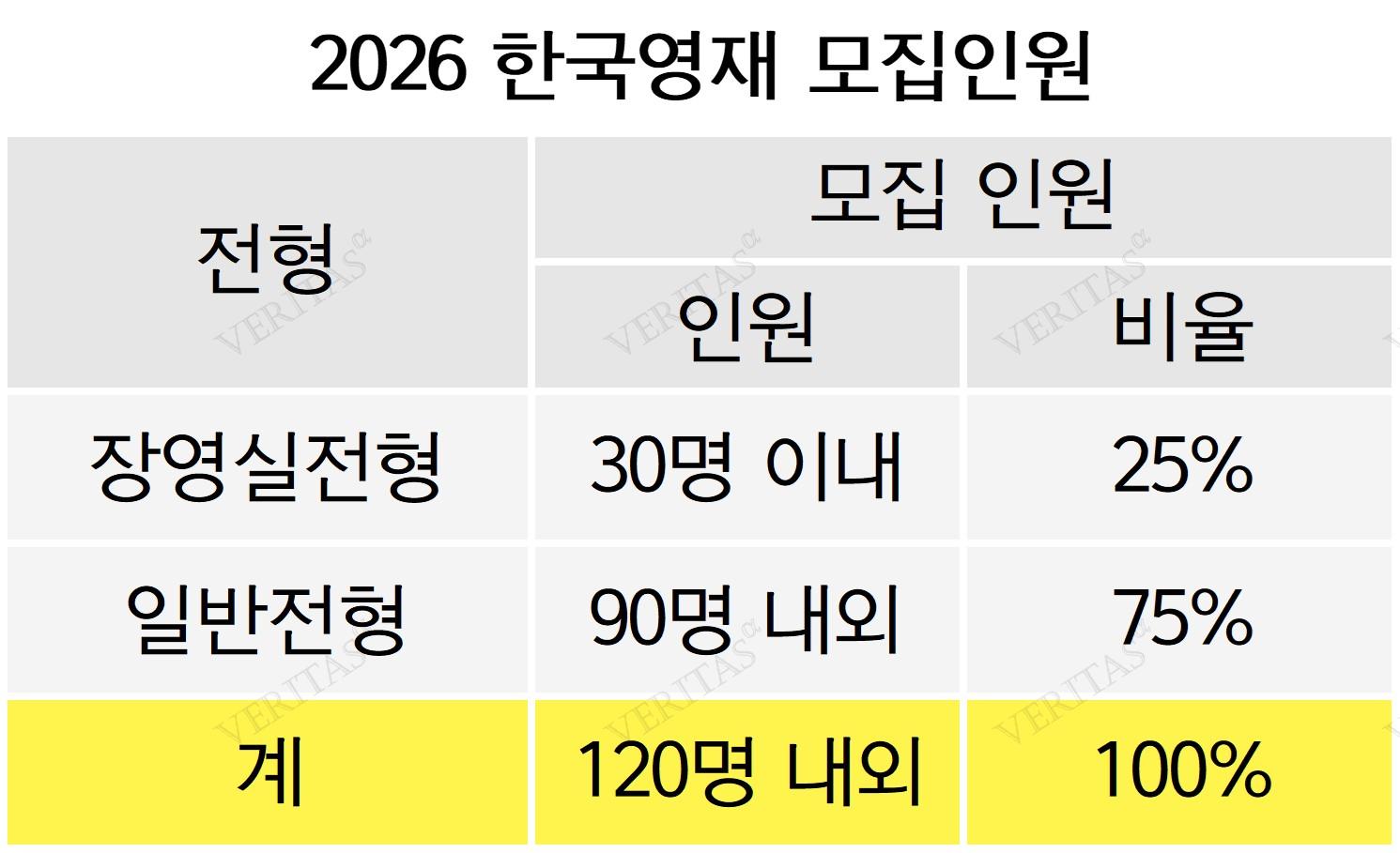한국영재의 2026 모집인원은 정원내 기준 120명 내외다. 장영실전형으로 정원의 25%인 30명 이내, 일반전형으로 75%인 90명 내외로 모집한다. 장영실전형으로는 기록물 평가와 심층구술면접만으로 학생을 선발한다. 독창적이고 지속적인 탐구 분야가 있어 해당 분야의 지식과 탐구 역량을 갖춘 학생을 선발하는 일종의 특기자전형이다. 수학/과학 전반에 고른 영재성과 잠재력을 갖고 있기보다는 특기탐구 분야에 몰입해 해당 분야의 우수한 탐구 역량을 보여주는 학생에게 적합하다. 개별 지원은 불가, 학교장의 추천을 통한 지원만 가능하다. 장영실전형에 추천받은 학생은 한국영재의 일반전형은 물론 다른 영재학교에도 중복으로 지원할 수 없다.