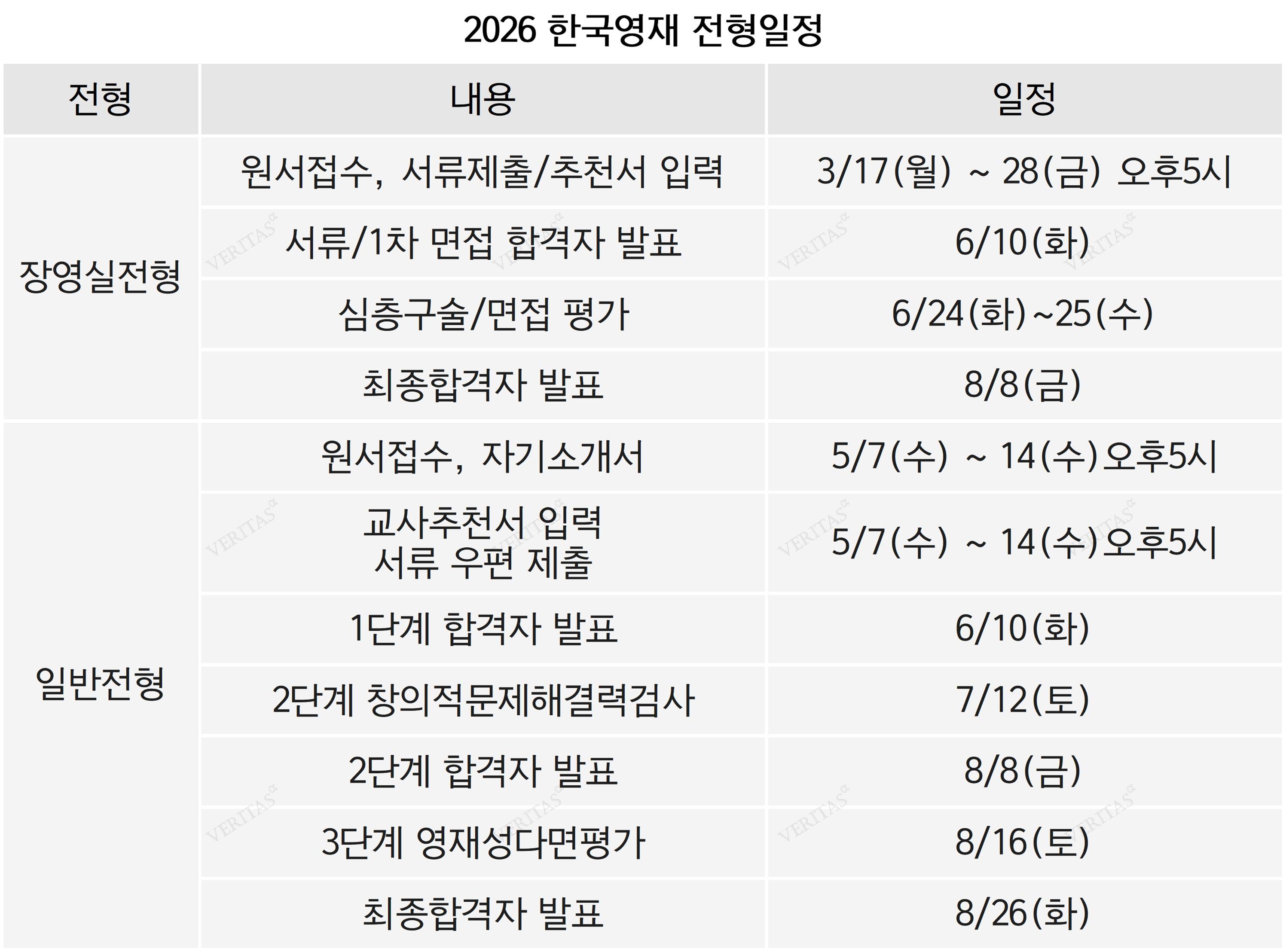 [베리타스알파=이상현 기자] 한국영재가 장영실전형 모집분야에 ‘자기주도 지역인재’를 신설한다. 기존 수학 물리 화학 생물 기타 5개 특기탐구 분야에서 기타가 빠지고 자기주도 지역인재가 들어온 것. 자기 주도적인 학습 의지와 사교육 도움 없이 수학/과학 심화 개념 독학 등 우수한 성과를 입증할 수 있는 각 지역의 학생을 선발한다는 취지다. 17개 시도(서울 부산 인천 대구 광주 대전 울산 세종 경기 강원 충북 충남 전북 전남 경북 경남 제주)에서 지역별로 2명 이내로 선발할 수 있다. 일반전형은 지난해와 큰 틀에서 동일하다. 한국영재는 이 같은 내용을 담은 2026 장영실/일반전형의 모집요강을 14일 공개했다. 지난해는 장영실전형 일반전형 순으로 공개했으나 올해는 동시 공개했다.