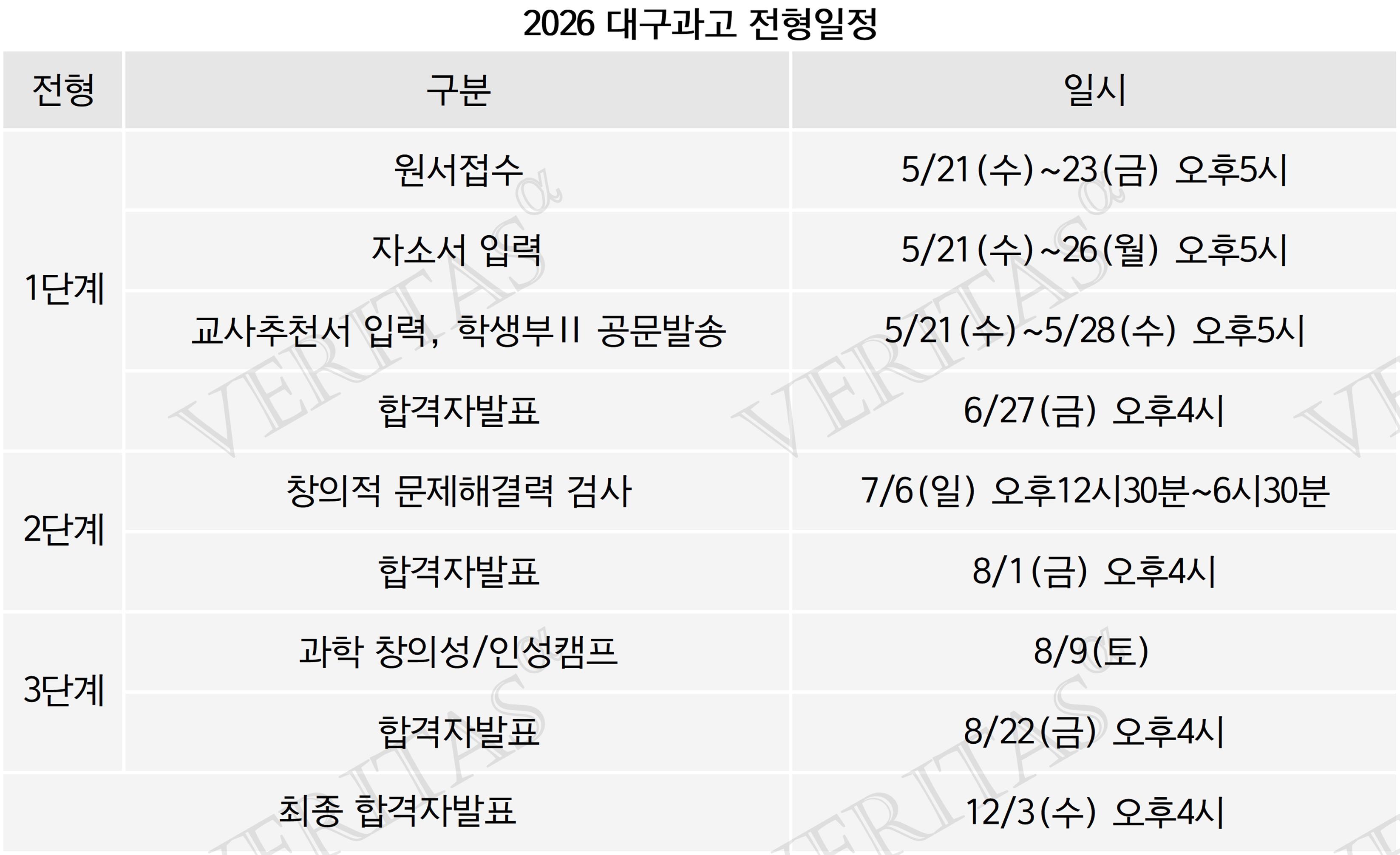 [베리타스알파=이상현 기자] 11일 공개한 대구과고 2026모집요강은 지난해와 큰 틀에서 동일하다. 대구과고는 지역인재 우선선발 대상으로 별도의 3단계 전형을 운영하는 특징이 있다. 1,2단계 결과를 종합해 지역인재 우선선발 대상자로 선정되면 3단계 별도 전형을 거쳐 합격자로 우선선발 되는 것이다. 인천영재 세종영재 서울과고 대전과고 등이 지역인재 우선선발도 모두 일반과 동일하게 1~3단계 전형에 참여하게 하는 것과는 차이가 있다. 대구과고 3단계 별도 전형의 정해진 시험 방식은 없다. 출제위원들의 심사와 심의에 따라 매해 변경되기 때문이다. 대구과고 관계자는 “3단계 전형 방식은 매해 바뀌는데 올해의 경우 아직 결정되지 않았다”고 설명했다.