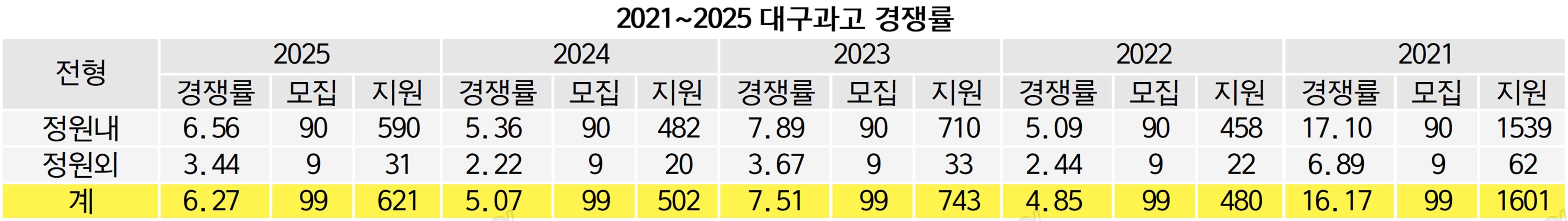대구과고 2025학년 경쟁률은 정원내 기준 6.56대1이다. 90명 모집에 590명이 지원한 결과다. 지난해 5.36대1(모집 90명/지원 482명)과 비교하면 지원자가 108명 늘면서 경쟁률이 상승했다. 정원외 경쟁률도 3.44대1(9명/31명)로 전년 2.22대1(9명/20명)보다 상승했다. 당초 의대증원에 따라 영재학교 경쟁률이 하락할 것이라는 전망과는 대비되는 모습이다. 경쟁률 상승요인으로는 지원풀 확대가 꼽힌다. 의대열풍으로 영재학교 인기가 주춤하면서 그간 최상위권만 지원했던 영재학교에 상위권 중학생까지도 몰렸다는 설명이다. 대구의 경우 사교육 특수를 누리기 좋은 만큼 영재학교 진학 후에도 정시로 의대 도전이 충분히 가능한 영향도 있을 것으로 보인다.