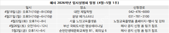 [베리타스알파=박한성 기자] 해사가 2026학년 4~5월 단독 입시설명회 일정을 16일 안내했다. 해사는 4월부터 5월 첫째주까지 총 5회의 단독설명회를 진행한다. 18일 오후7시10분부터 8시30분까지 대전 제일학원에서 처음으로 진행하며, 다음은 21일 오후5시10분에서 6시10분까지 분당 메가스터디에서 진행한다. 이어 22일 오후7시부터 8시까지 서울 노원교육플랫폼, 26일 오전10시부터 12시까지 부산 국회도서관 영상세미나실, 내달 2일 오후1시부터 6시까지 순천만생태문화교육원에서 설명회가 예정됐다.
