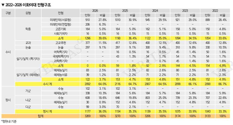 이화여대는 2026대입에서 정원 내 기준 수시 2092명(64%), 정시 1177명(36%)으로 총 3269명을 모집한다. 지난해 수시 2116명(64.7%), 정시 1154명(35.3%)을 모집한 데서 수시 비중이 소폭 축소됐다. 대신 특기자의 폐지로 학종의 비중이 확대된 점이 눈에 띈다. 전형별로 수시 학종의 모집인원은 1296명(39.6%)이다. 학종은 미래인재(서류형) 910명(27.8%), 미래인재(면접형) 206명(6.3%), 고른기회 164명(5%), 사회기여자 16명(0.5%)으로 세분화한다. 교과전형인 고교추천 377명(11.5%)과 논술전형 297명(9.1%), 실기전형(예체능실기/예체능서류) 122명(3.7%)의 모집인원이다. 정시에서는 가군 수능 102명(3.1%) 예체능실기 338명(10.3%), 나군 수능 608명(18.6%) 예체능실기 30명(0.9%), 다군 수능 99명(3%) 규모다.