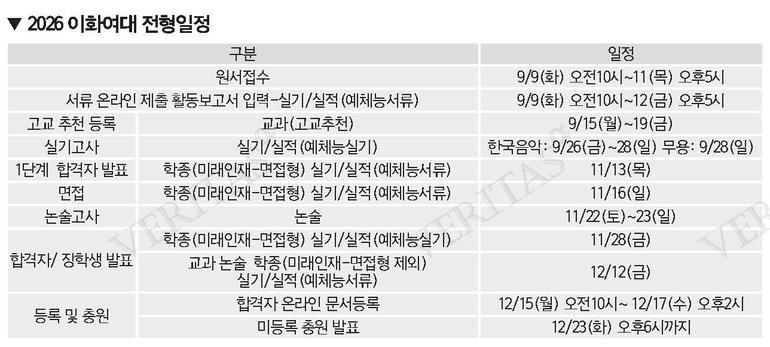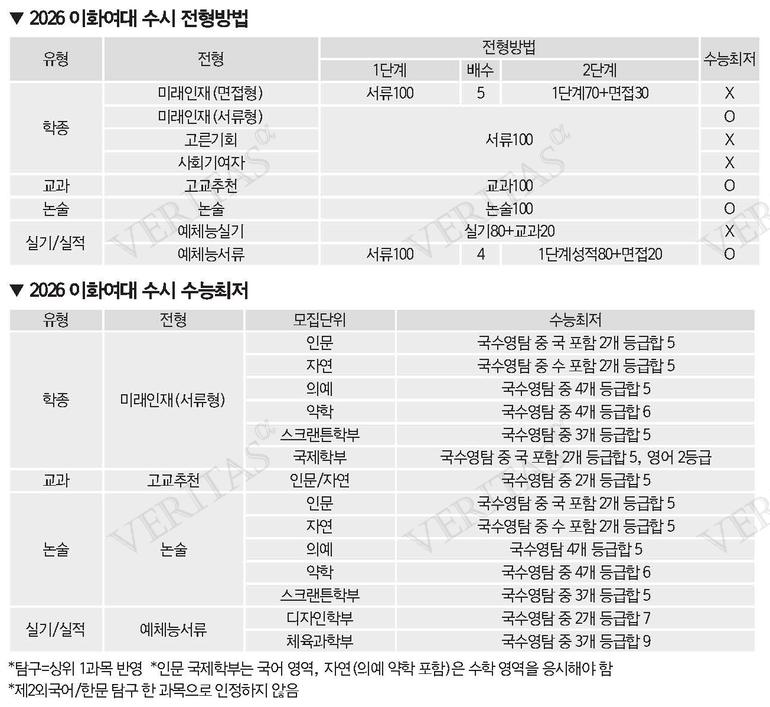 이화여대는 올해 대표 학종인 미래인재를 서류형과 면접형으로 분리해 모집한다. 서류형은 910명, 면접형은 206명을 모집한다. 올해 면접형이 신설됐다. 신설 면접형은 1단계에서 서류100%로 5배수를 선발한 뒤, 2단계에서 1단계70%+면접30%로 반영한다. 수능최저는 적용하지 않는다. 서류형은 서류100%에 수능최저를 적용해 선발한다. 지원자격은 고교 졸업자(2026년 2월 졸업예정자 포함) 또는 법령에 의해 고교 졸업자와 동등한 학력이 있다고 인정된 자로 같다.