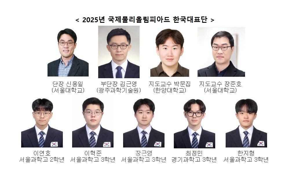 올해 국제물리올림피아드 한국대표단은 신용일(서울대) 단장이 이끌었다. 부단장은 김근영(GIST) 교수가 맡았다. 박문집(한양대) 장준호(서울대) 교수도 지도교수로 참가했다. 신용일 한국물리학회 한국물리올림피아드위원장은 “한국 대표단 전원이 메달을 획득하는 우수한 성과를 거둬 매우 기쁘다. 바쁜 학업 속에서도 꾸준히 노력해 국위를 선양한 학생들이 자랑스럽고, 앞으로도 과학에 대한 꿈과 재능을 마음껏 펼쳐 나가기를 바란다”고 전했다.