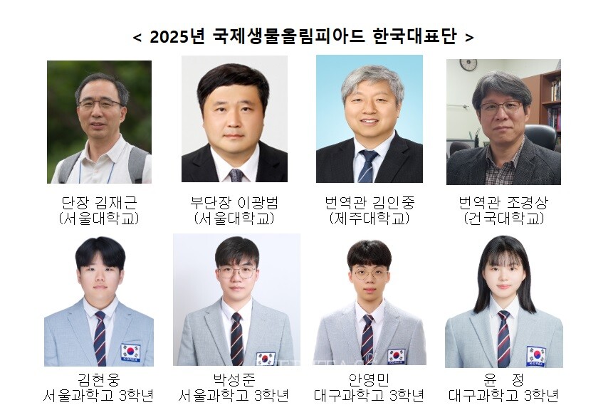 올해 국제생물올림피아드는 서울대 김재근 교수가 이끌었다. 부단장은 이광범 서울대 교수다. 조경상 건국대 교수와 김인중 제주대 교수가 번역관으로 함께했다. 김재근 한국생물교육학회 한국생물올림피아드 위원장은 “국가대표 학생들이 생명과학을 공부하는 동안 즐거워하고, 국제대회에서 다른 나라 대표들과 교류하는 것을 보니 우리나라 생명과학의 미래가 밝다고 느꼈다”며 “앞으로도 즐겁게 공부하고 서로 교류하면서 자신의 재능을 발전시키기를 바란다”고 말했다.