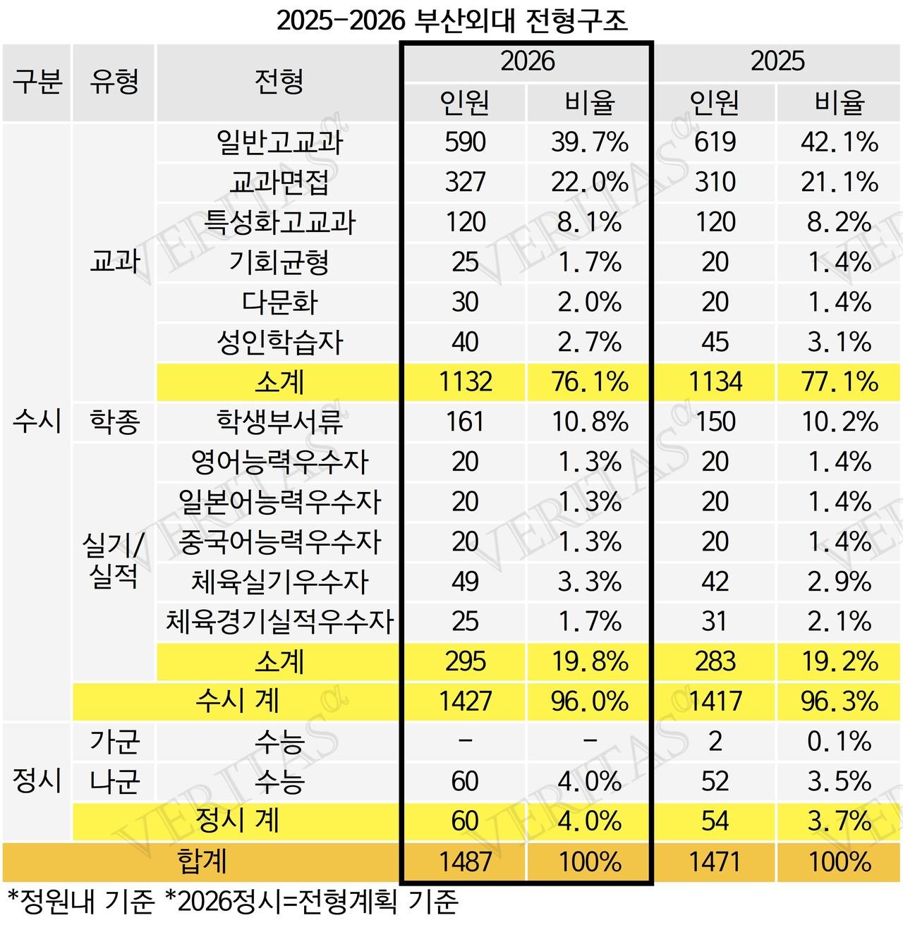 부산외대는 정원내 기준 수시로 1427명을 모집한다. 수시/정시 합산 모집인원의 96%에 해당한다. 지난해 1417명(96.3%)과 비슷한 규모를 유지했다. 수시는 교과전형이 최대 규모다. 6개 전형으로 1132명(76.1%)을 모집한다. 일반고교과가 590명(39.7%), 교과면접 327명(22%), 특성화고교과 120명(8.1%), 기회균형 25명(1.7%), 다문화 30명(2%), 성인학습자 40명(2.7%)이다. 학종은 학생부서류 1개 전형으로만 161명(10.8%)을 모집한다. 실기/실적으로는 영어/일본어/중국어능력우수자가 각 20명(1.3%)을 모집하고, 체육실기우수자 49명(3.3%), 체육경기실적우수자 25명(1.7%)이다.