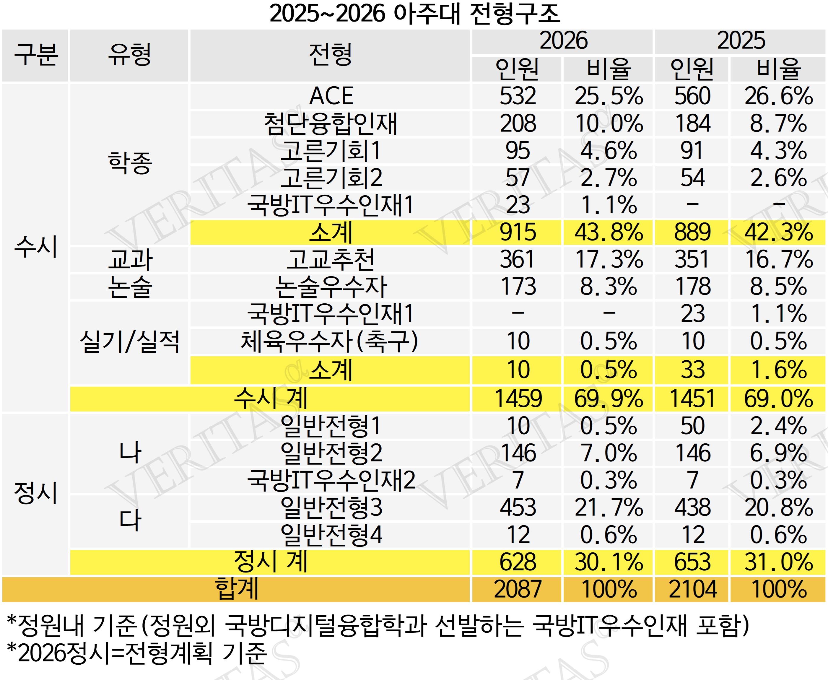 [베리타스알파=이상현 기자] 4개 첨단학과를 보유한 아주대는 올해 교육부로부터 2개의 첨단학과 71명 증원을 승인받았다. 지능형반도체공학과가 41명 증원(40명→81명), 첨단바이오융합대학이 30명(75명→105명) 증원됐다. 특히 지능형반도체공학과 21명과, 첨단바이오융합대학 30명 등 51명은 ‘순증’ 방식의 증원이다. 나머지 20명(지능형반도체공학과)의 경우 학교 자체정원 20명을 활용했다. 수시 모집인원을 보면 첨단바이오융합대학이 지난해 52명에서 73명으로 늘었고, 지능형반도체공학과가 23명에서 54명으로 증가했다. 나머지 2개 첨단학과 미래모빌리티공학과 90명(수시/정시 합산 137명), 첨단신소재공학과 63명(85명)까지 합산하면 수시에서 280명의 첨단학과를 선발한다.