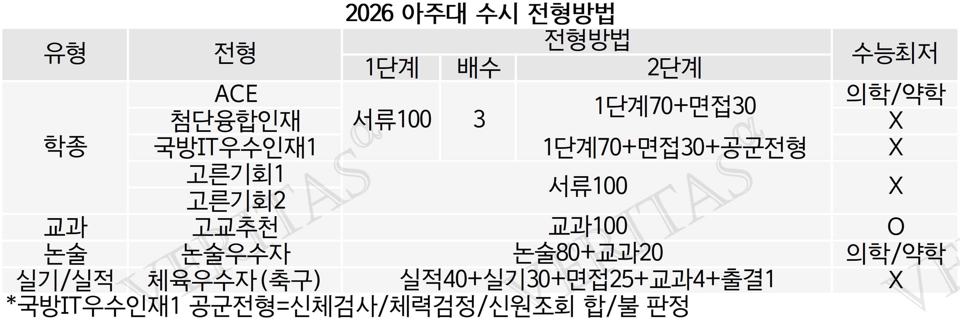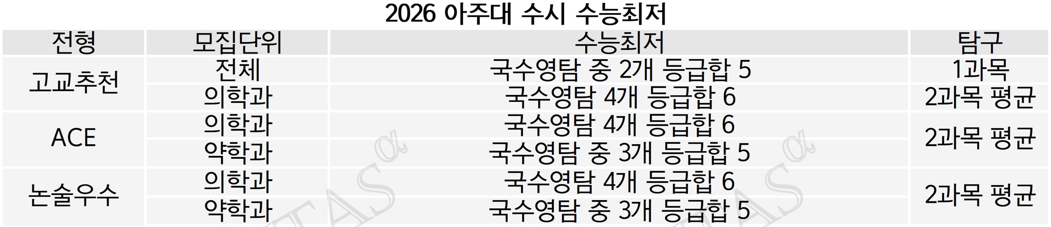 수능최저는 ACE에서 모집하는 의학과 약학과에 한해 적용한다. 의학과는 국수영탐 중 의학과는 4개합 6이내, 약학과는 3개합 5이내를 충족해야 한다. 탐구는 2과목 평균을 반영한다. 지난해와 모두 동일하다.