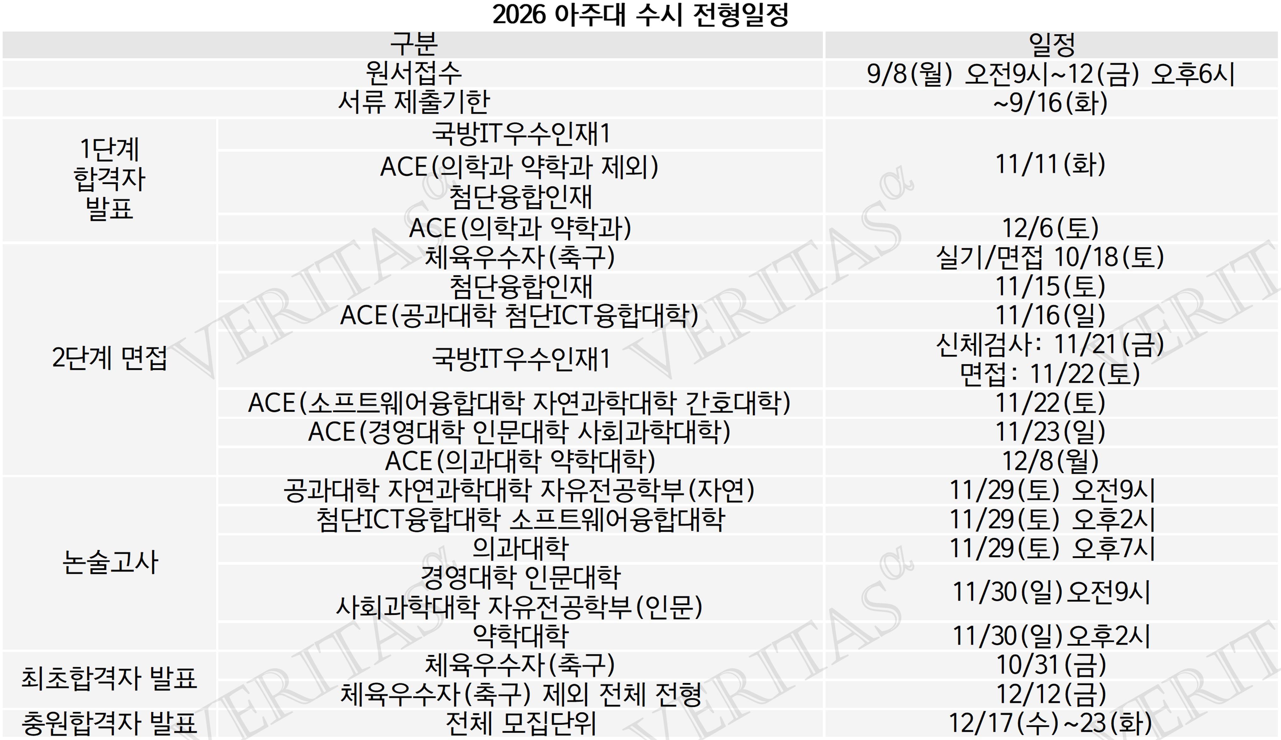 수시 원서접수 기간은 9월8일 오전9시부터 12일 오후6시까지다. 서류는 16일까지 제출하면 된다. 1단계 합격자 발표일은 국방IT우수인재1, 학종 ACE(의학과 약학과 제외) 첨단융합인재가 각 11월11일, ACE(의학과 약학과)가 12월6일이다.