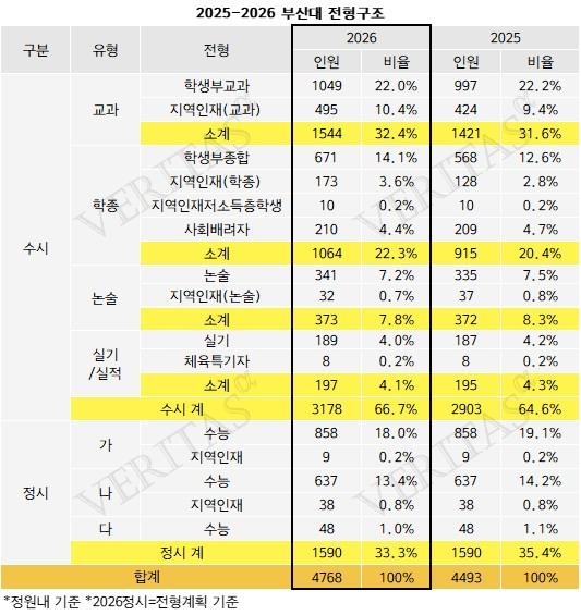 부산대의 올해 정원내 기준 수시 모집인원은 3178명이다. 수시/정시 합산 모집인원의 66.7%에 해당한다. 지난해 수시 모집인원인 2903명(64.6%)에 비해 인원과 비율 모두 증가했다. 수시는 교과, 학종, 논술, 실기/실적 4개 전형으로 운영한다. 교과전형이 2개 전형으로 1544명(32.4%)을 모집하며 최대 규모다. 학생부교과가 1049명(22%), 지역인재(교과)가 495명(10.4%)이다. 학종은 4개 전형으로 1064명(22.3%)을 모집한다. 학생부종합 671명(14.1%), 지역인재(학종) 173명(3.6%), 지역인재저소득층학생 10명(0.2%), 사회배려자 210명(4.4%)이다. 논술은 373명(7.8%)을 모집한다. 논술이 341명(7.2%), 지역인재(논술)가 32명(0.7%)이다. 실기/실적은 197명(4.1%)을 모집한다. 실기가 189명(4%), 체육특기자가 8명(0.2%)이다.