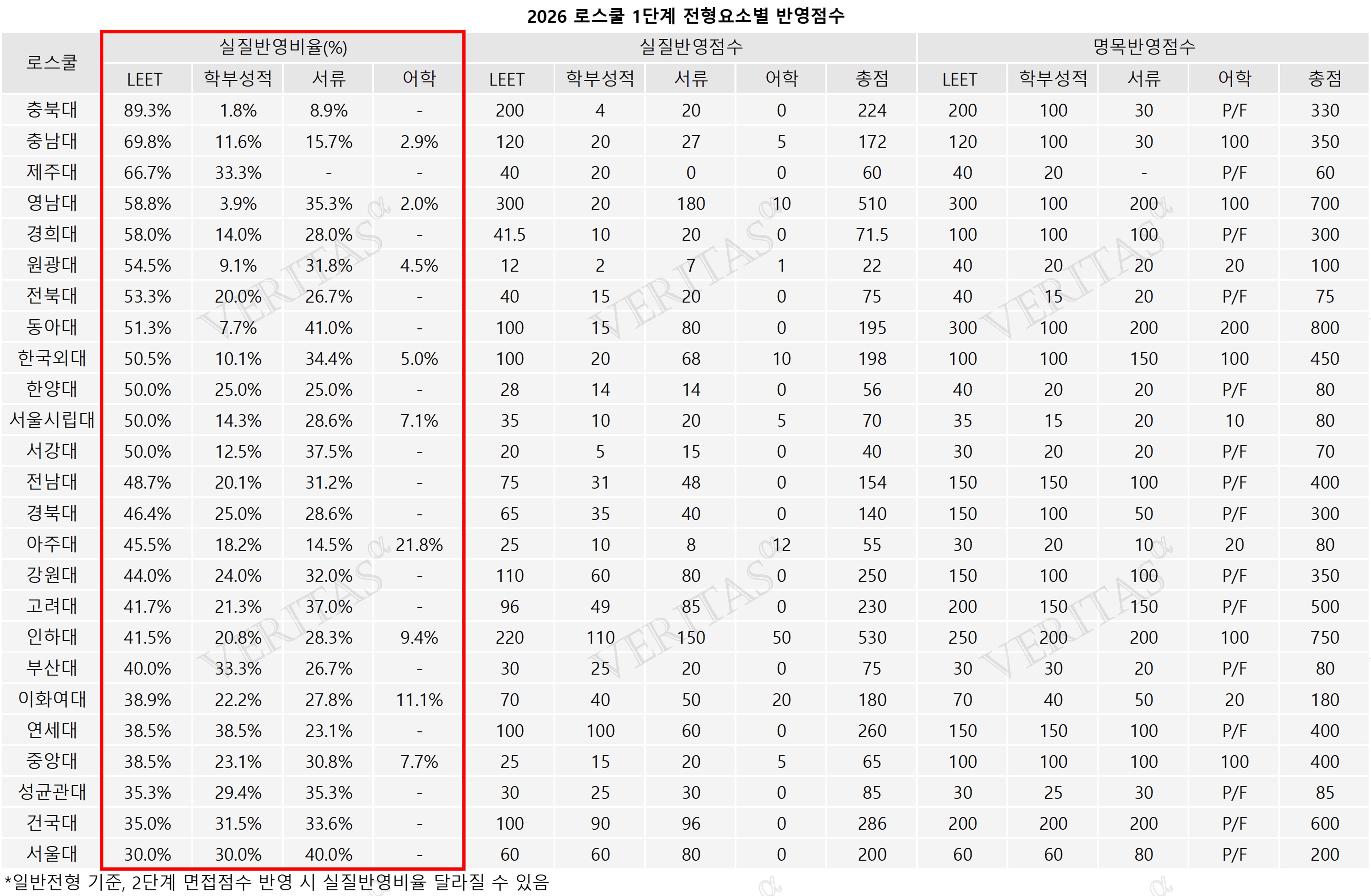 <2026로스쿨 1단계 전형요소별 반영비율.. LEET 충북대 89.3% ‘최고’>