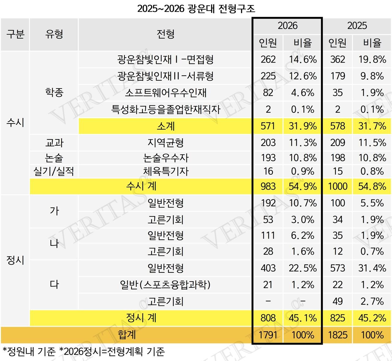 광운대의 올해 정원내 기준 수시 모집인원은 983명이다. 수시/정시 합산 모집인원의 54.9%에 해당한다. 지난해 수시 모집인원인 1000명(54.8%)에 비해 인원이 감소했으나, 정시 모집인원도 줄어들며 비율은 소폭 증가했다. 수시는 학종, 교과, 논술, 실기/실적 4개 전형으로 운영한다. 학종이 4개 전형으로 571명(31.9%)을 모집하며 최대 규모다. 광운참빛인재Ⅰ-면접형이 262명(14.6%), 광운참빛인재Ⅱ-서류형 225명(12.6%), 소프트웨어우수인재 82명(4.6%), 특성화고졸업재직자 2명(0.1%)이다. 교과는 지역균형 1개전형으로 203명(11.3%)을 모집하고, 논술은 논술우수자로 193명(10.8%), 실기/실적은 체육특기자로 16명(0.9%)을 모집한다.