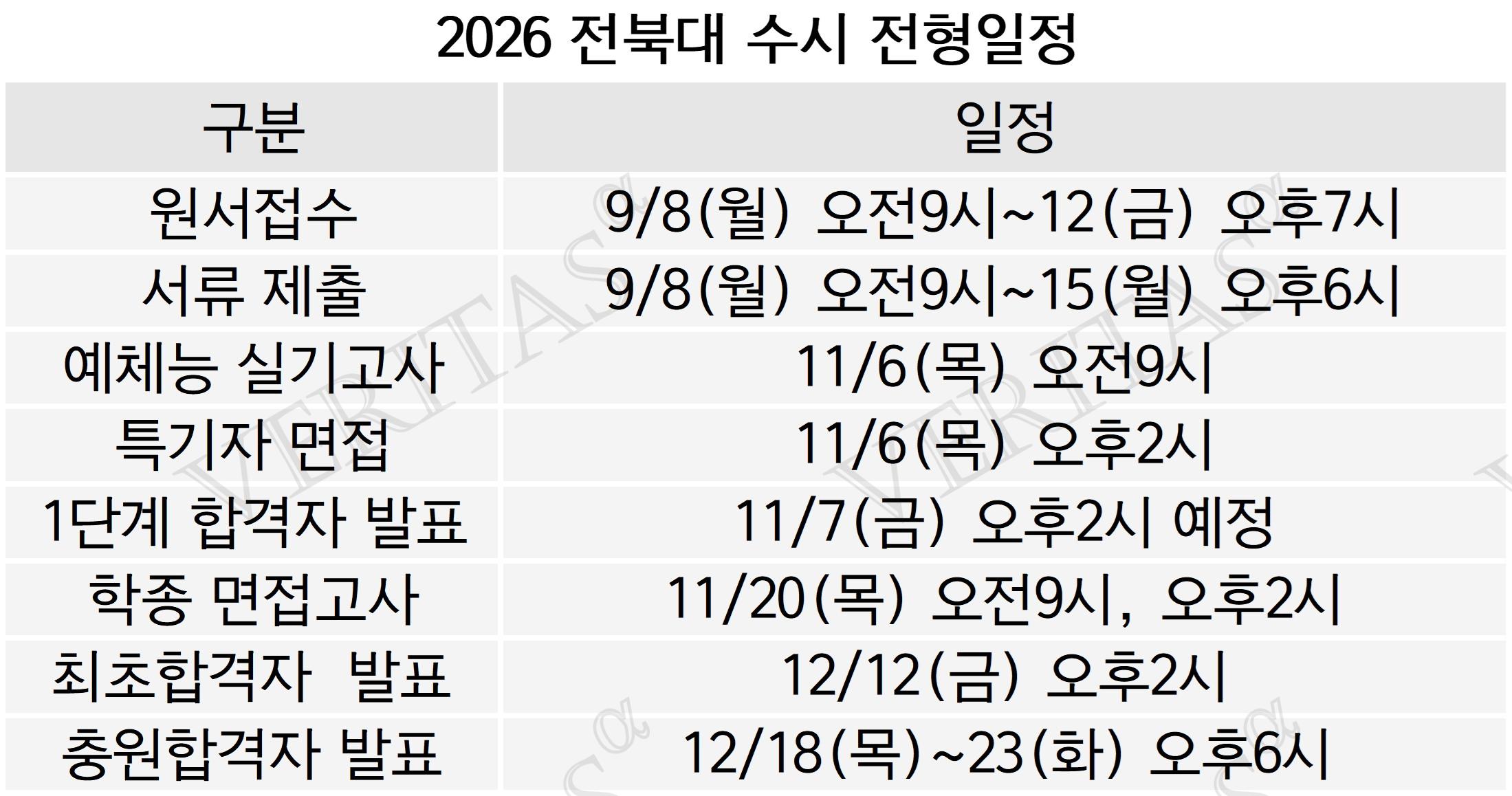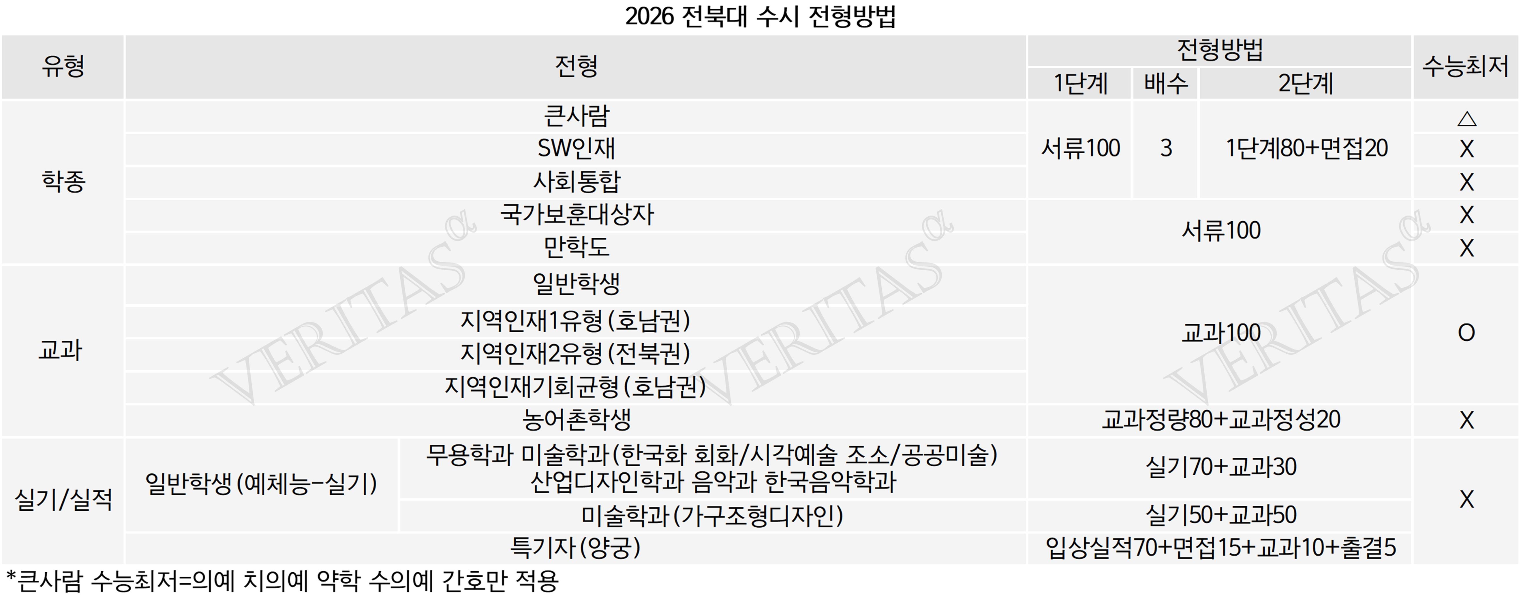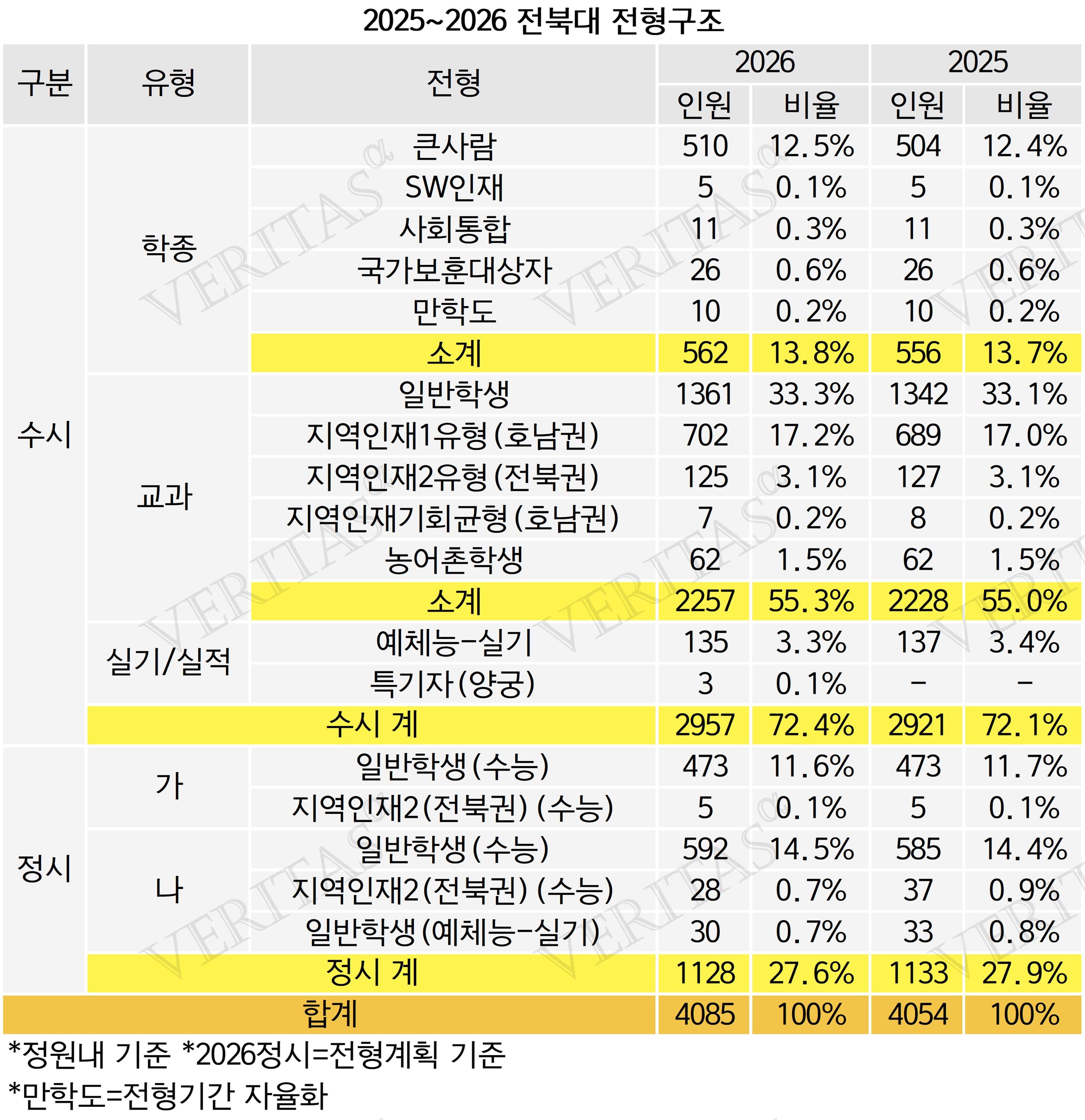 수시 최대전형은 지난해에 이어 교과전형이다. 선발인원은 총 2257명(55.3%)이다. 지난해 2228명(55%)보다 늘어났다. 세부 전형별로 보면 일반학생 1361명(33.3%), 지역인재1유형(호남권) 702명(17.2%), 지역인재2유형(전북권)125명(3.1%), 농어촌학생 62명(1.5%), 지역인재기회균형(호남권) 7명(0.2%로 지난해와 동일하게 5개 전형을 운영한다. 농어촌학생을 제외하면 모두 교과100%에 수능최저를 적용해 선발한다. 농어촌은 수능최저 없이 교과정량80%+교과정성20%로 선발한다.