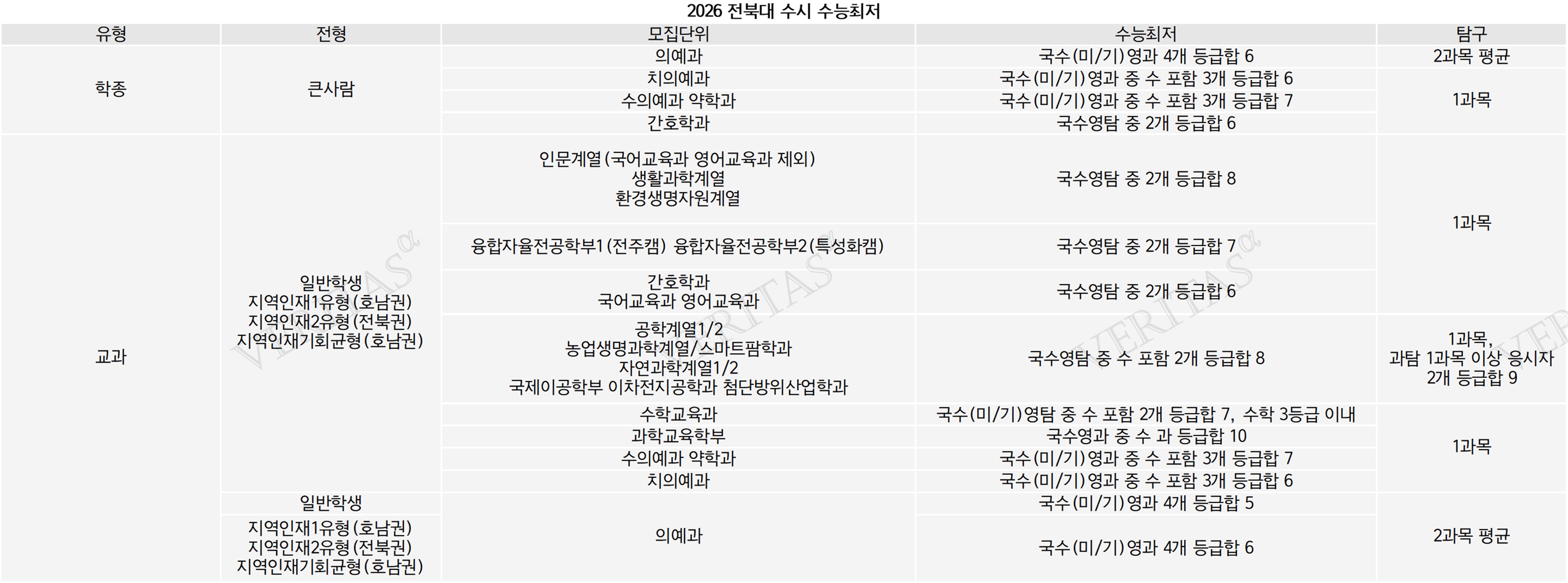 전북대 교과전형 수능최저는 모집단위별로 세분화돼 있어 주의할 필요가 있다. 먼저 인문계열(국어교육과 영어교육과 제외) 생활과학계열 환경생명자원계열은 국수영탐 중 2개합 8이내다. 간호학과 국어교육과 영어교육과는 국수영탐 중 2개합 6이내다. 공학계열1/2 농업생명과학계열/스마트팜학과 자연과학계열1/2 국제이공학부 이차전지공학과 첨단방위산업학과는 국수영탐 중 수학 포함 2개합 8이내다. 단 과탐 1과목 이상 응시자는 수능최저를 1등급 하향해 적용한다. 과탐을 1과목 이상 응시하면 2개합 9이내만 충족하면 되는 식이다. 수학교육과는 국수영탐 중 수학 포함 2개합 7이내이며 수학은 3등급 이내여야 한다. 과학교육학부는 수학과 과학만 반영하며 2개 등급합이 10이내여야 한다.
