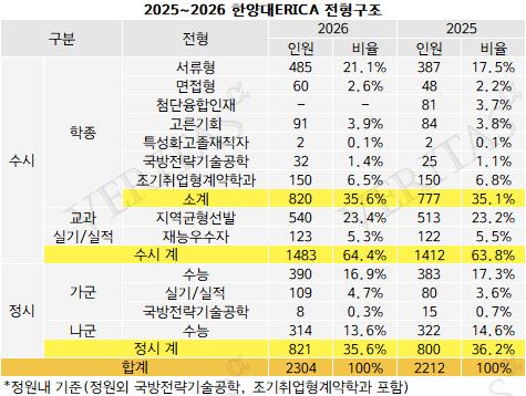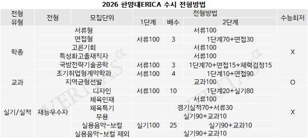 한양대ERICA 대표 학종인 서류형과 면접형은 면접 실시 여부로 구분할 수 있다. 서류형은 서류100%로, 면접형은 서류100%로 3배수를 선발한 뒤, 2단계에서 1단계70%+면접30%로 합산한다. 국내 정규 고교 졸업(예정)자 또는 법령에 의한 동등 학력 인정자라면 지원할 수 있다. 특히 두 전형뿐 아니라 학종 전 전형은 수능최저를 적용하지 않는다.