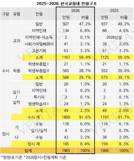 국립한국교통대의 올해 정원내 기준 수시 모집인원은 1800명이다. 수시/정시 합산 모집인원의 91.6%에 해당한다. 지난해 수시 모집인원인 1747명(91.7%)에 비해 모집인원은 상승하고, 비율은 정시가 일부 확대되며 소폭 감소했다. 수시는 교과, 학종, 실기/실적 3개로 운영한다. 교과가 5개 전형으로 1167명(59.4%)을 모집하며 최대 전형이다. 전형별로는 일반 927명(47.2%), 지역인재 134명(6.8%), 지역인재-저소득 2명(0.1%), 사회기여및배려자 41명(2.1%), 고른기회 63명(3.2%)이다. 학종으로는 학생부종합Ⅰ, Ⅱ 2개 전형으로 584명(29.7%)을 모집한다. 학생부종합Ⅰ 21명(1.1%), 학생부종합Ⅱ 563명(28.7%)이다. 실기/실적은 4개 전형으로 49명(2.5%)을 모집한다. 일반 20명(1%), 지역인재 3명(0.2%), 특기자 2명(0.1%), 평생학습자Ⅰ 24명(1.2%)이다.