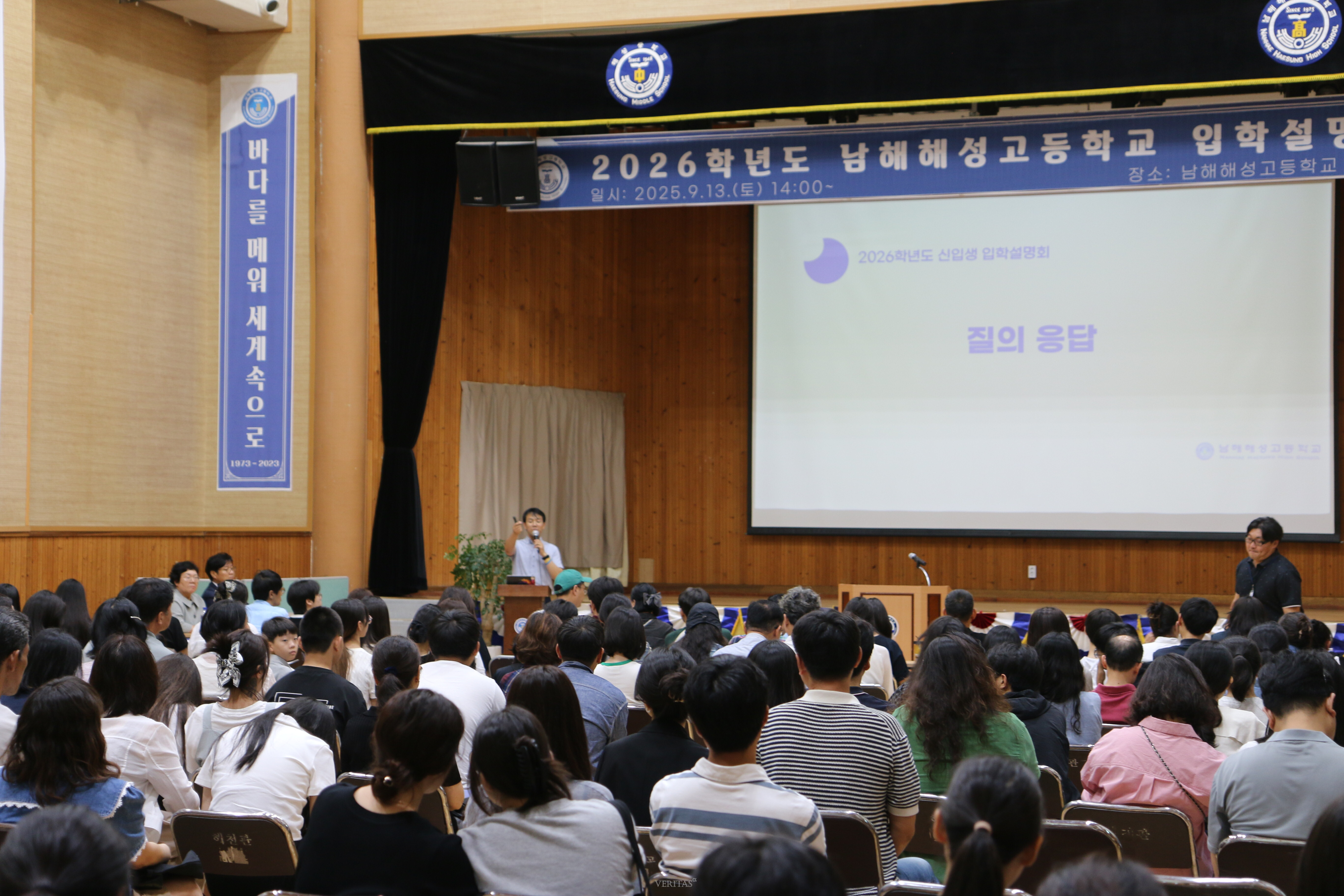 [베리타스알파=이상현 기자] 남해해성고가 13일 ‘2026학년 신입생 모집 3차 입학설명회’를 실시했다. 전국 각지에서 학생과 학부모 250여 명이 참석했다. 지난 2차 설명회 76가족보다 많은 96가족이 참석했다. 남해해성고를 향한 높은 관심이 입증된 셈이다. 설명회는 ‘2026학년 입학 홍보 안내서‘를 바탕으로 진행됐다. 특히 고교학점제가 도입된 2022 개정 교육과정 시대를 맞아 야심차게 준비한 파이데이아(PAIDEIA) 커리큘럼과 2028 대입에서 남해해성고가 가지는 장점을 홍보하는 시간에 학부모들의 관심이 집중됐다. 하상운 교무기획부장은 “2022개정 교육과정에 발맞춰 2025학년 신입생들부터 적용하고 있는 파이데이아 교육과정은 1학년들이 수강하는 전 교과에서 개념 이해 중심의 토론식 수업을 실시하며, 사고력 향상을 위한 논술형 평가를 학기별 1,2차 고사에 도입한 것이 특징”이라고 설명했다. 이외에도 보물섬국제학술포럼/명사 특강/교내 학술제/교과 융합 프로젝트/생태 전환 교육/스마트팜/해성 해피데이/멘토링 체육대회 등 학업/공동체/진로 역량을 함양하는 남해해성고의 특색 교육이 소개됐다.