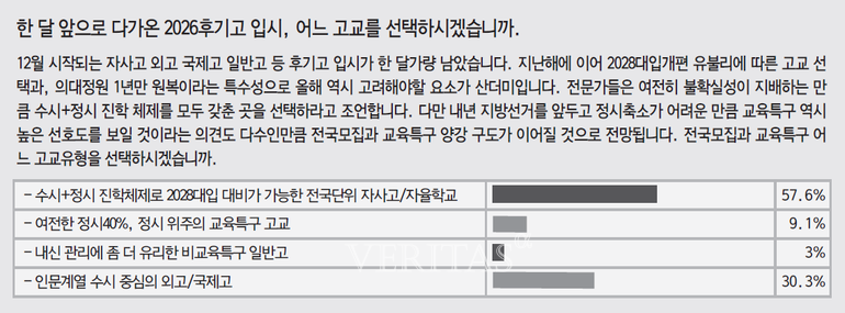 [베리타스알파=신현지 기자] 후기고 입시를 앞두고 학부모들의 고민이 깊어지고 있습니다. 2028대입개편 이후 대입에서의 유불리를 지금부터 따져봐야하기 때문입니다. 특히 올해부터 본격 시행된 고교학점제를 두고 현장 혼란이 이어지는 등 잡음이 일면서 고교 선택이 보다 중요해졌습니다. 의대는 물론 서울대 등 상위대 진학 가능성과 목표로 하는 계열에 따라서도 우선해야 하는 고교 선택지가 달라집니다. 각자의 성향과 진로에 대한 청사진을 바탕으로 전략적으로 고교를 선택해야 하는 셈입니다.